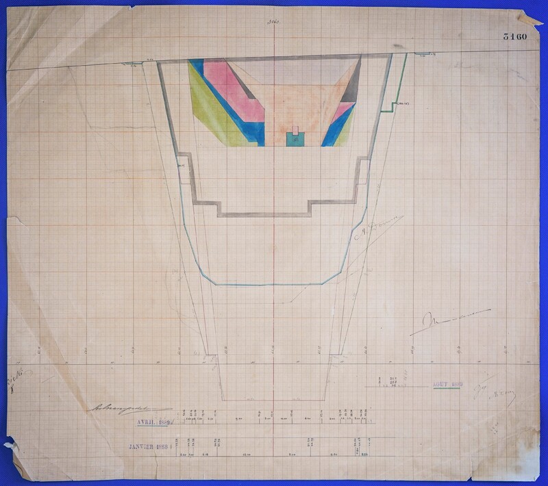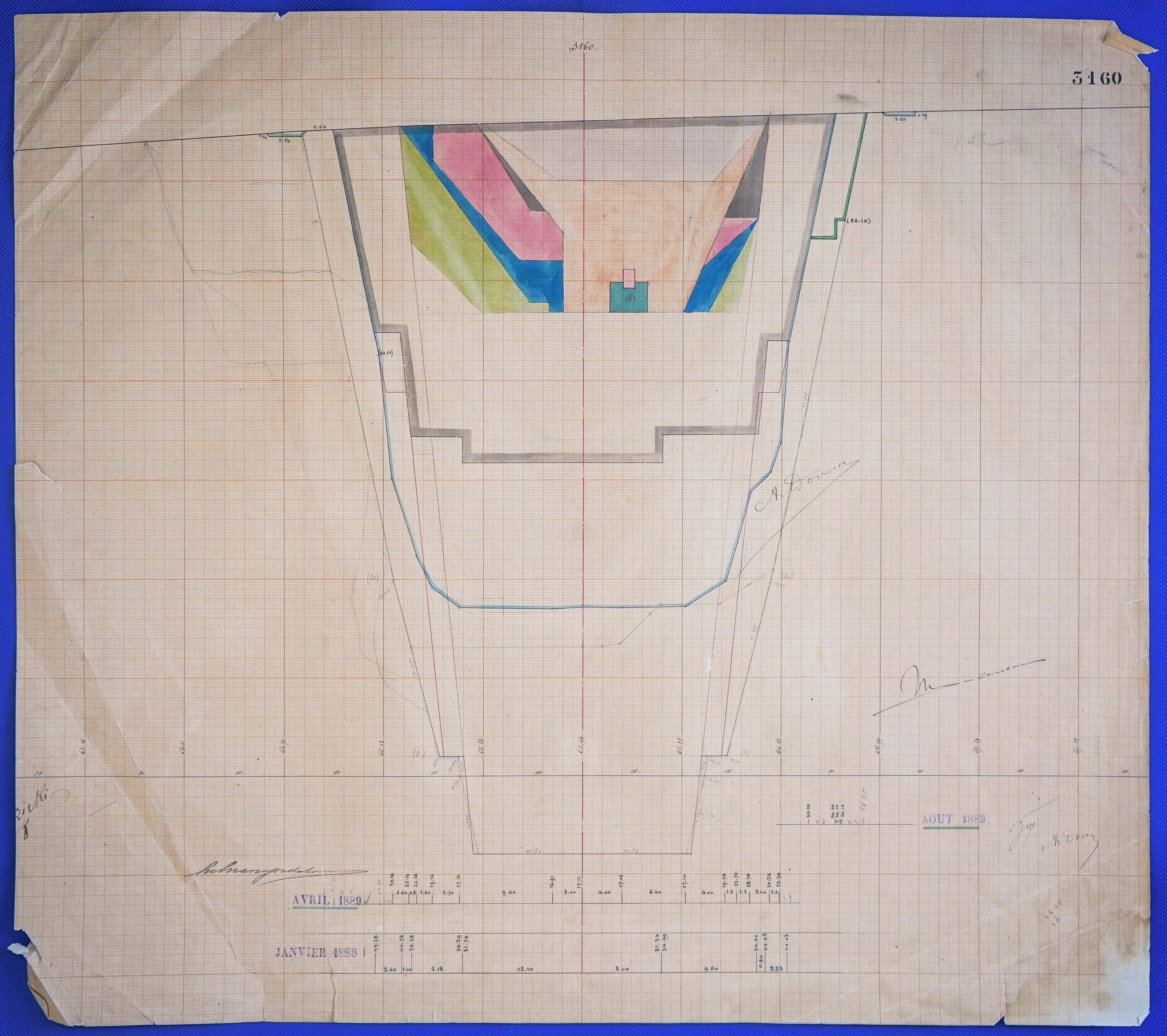 - Έγχρωμο σχέδιο προόδου εκσκαφικών εργασιών (μηκοτομή) χιλ. σημείου 3160 με μελάνι και έγχρωμο μολύβι σε χαρτί μιλιμετρέ.