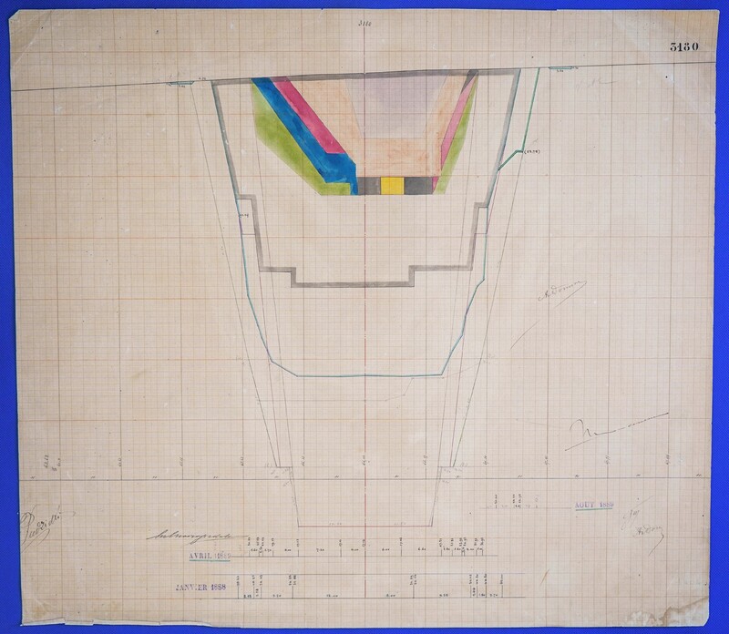 - Έγχρωμο σχέδιο προόδου εκσκαφικών εργασιών (μηκοτομή) χιλ. σημείου 3180 με μελάνι και έγχρωμο μολύβι σε χαρτί μιλιμετρέ.