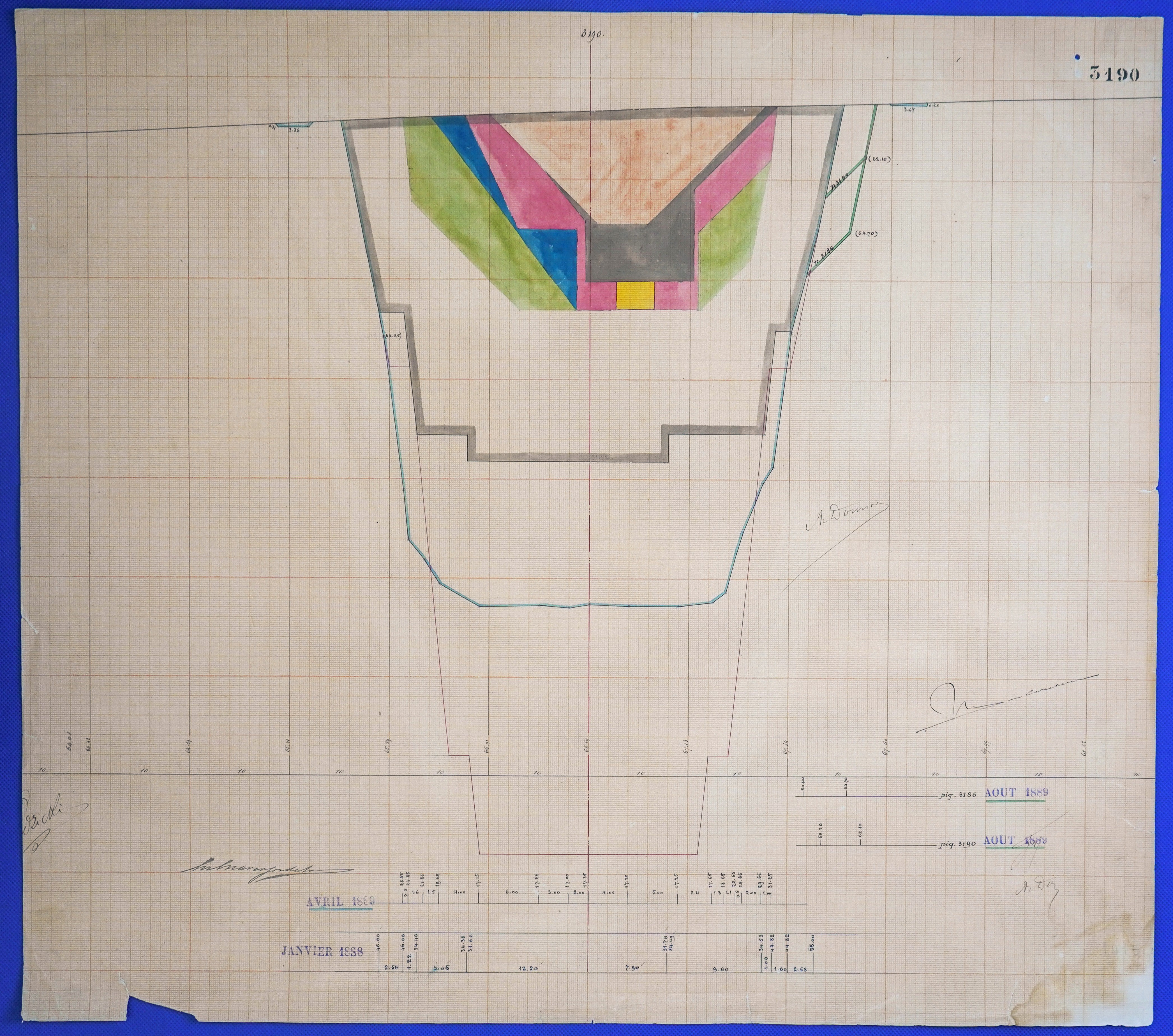 - Έγχρωμο σχέδιο προόδου εκσκαφικών εργασιών (μηκοτομή) χιλ. σημείου 3190 με μελάνι και έγχρωμο μολύβι σε χαρτί μιλιμετρέ.