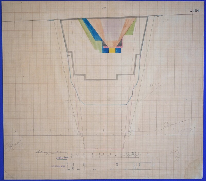 - Έγχρωμο σχέδιο προόδου εκσκαφικών εργασιών (μηκοτομή) χιλ. σημείου 3220 με μελάνι και έγχρωμο μολύβι σε χαρτί μιλιμετρέ.