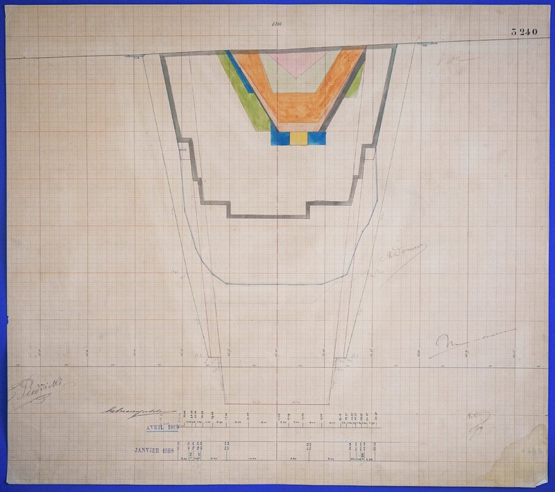 - Έγχρωμο σχέδιο προόδου εκσκαφικών εργασιών (μηκοτομή) χιλ. σημείου 3240 με μελάνι και έγχρωμο μολύβι σε χαρτί μιλιμετρέ.