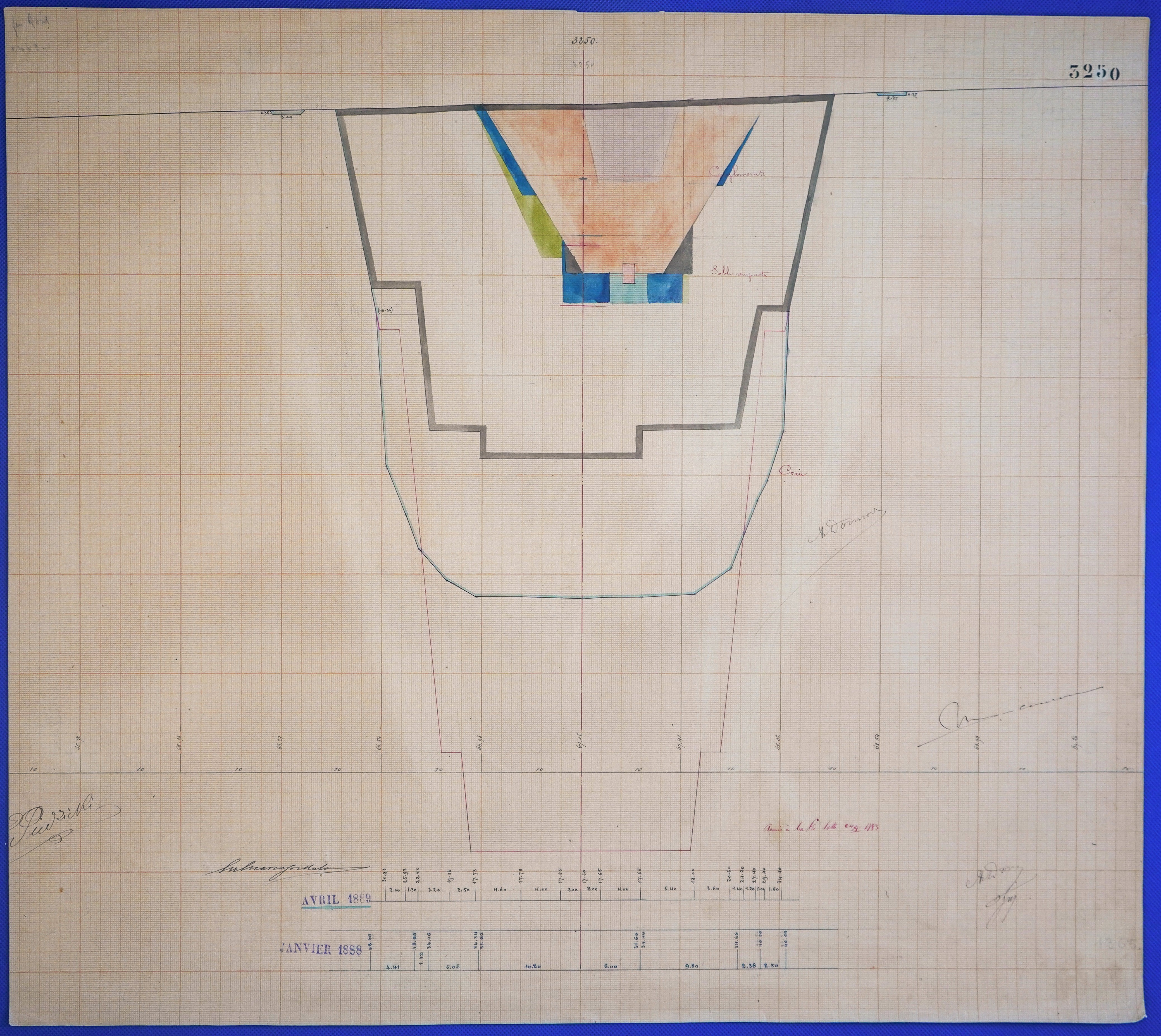 - Έγχρωμο σχέδιο προόδου εκσκαφικών εργασιών (μηκοτομή) χιλ. σημείου 3250 με μελάνι και έγχρωμο μολύβι σε χαρτί μιλιμετρέ.