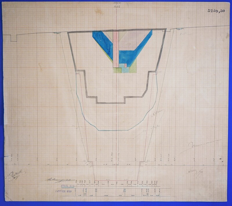 - Έγχρωμο σχέδιο προόδου εκσκαφικών εργασιών (μηκοτομή) χιλ. σημείου 3289,50 με μελάνι και έγχρωμο μολύβι σε χαρτί μιλιμετρέ.