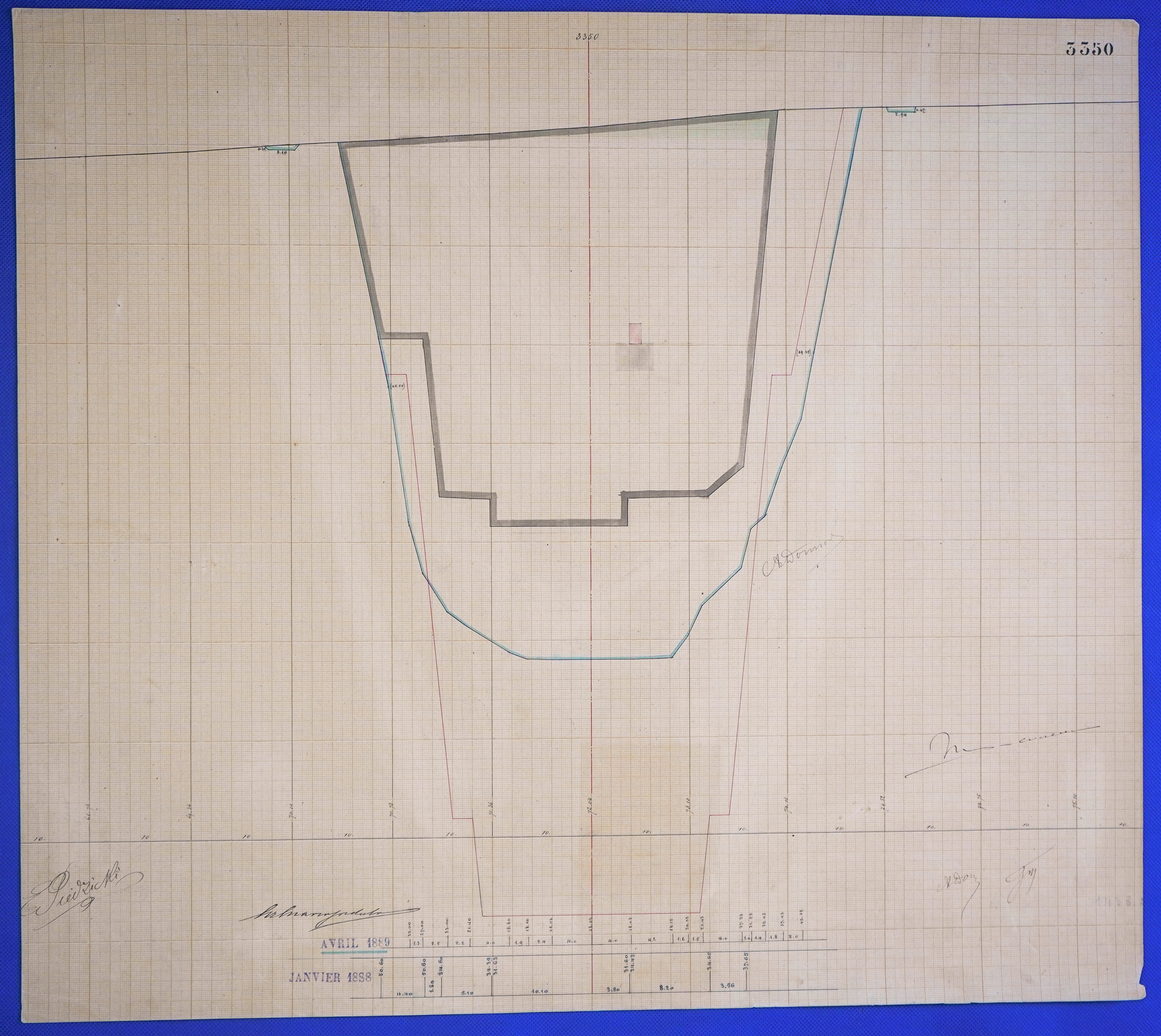 - Έγχρωμο σχέδιο προόδου εκσκαφικών εργασιών (μηκοτομή) χιλ. σημείου 3350 με μελάνι και έγχρωμο μολύβι σε χαρτί μιλιμετρέ.