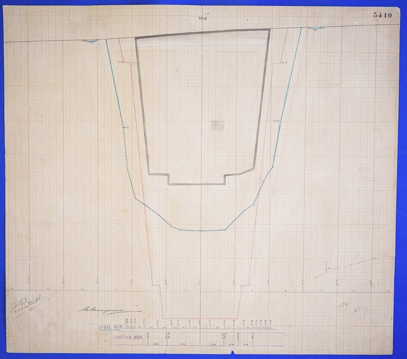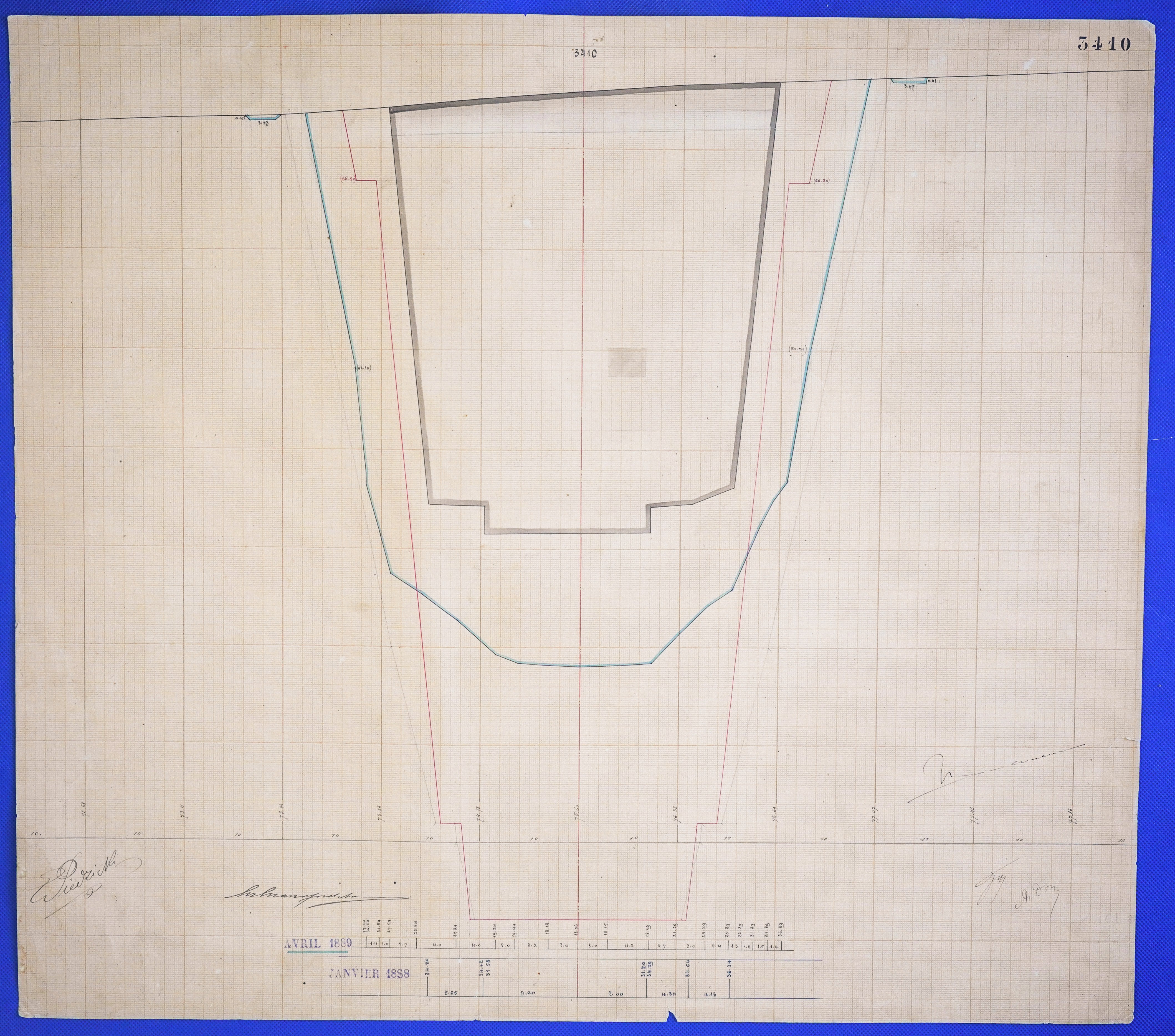 - Έγχρωμο σχέδιο προόδου εκσκαφικών εργασιών (μηκοτομή) χιλ. σημείου 3410 με μελάνι και έγχρωμο μολύβι σε χαρτί μιλιμετρέ.