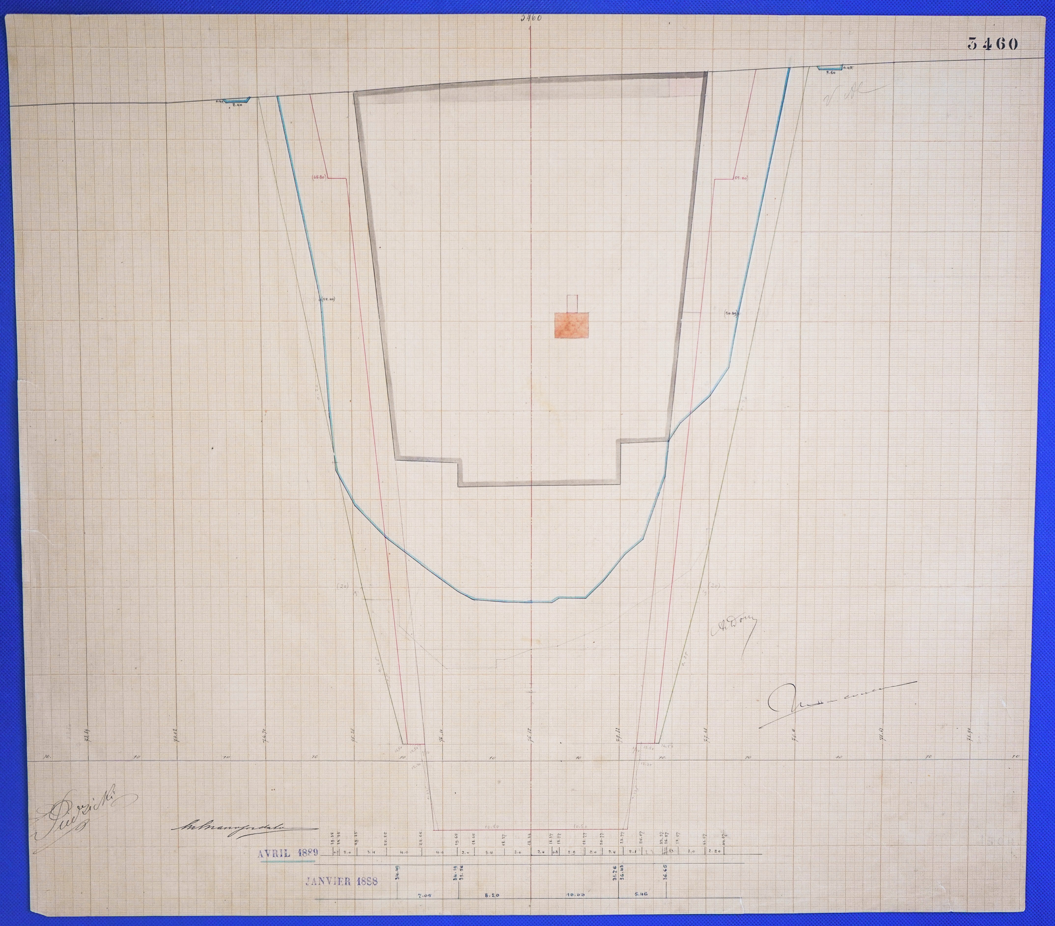 - Έγχρωμο σχέδιο προόδου εκσκαφικών εργασιών (μηκοτομή) χιλ. σημείου 3460 με μελάνι και έγχρωμο μολύβι σε χαρτί μιλιμετρέ.