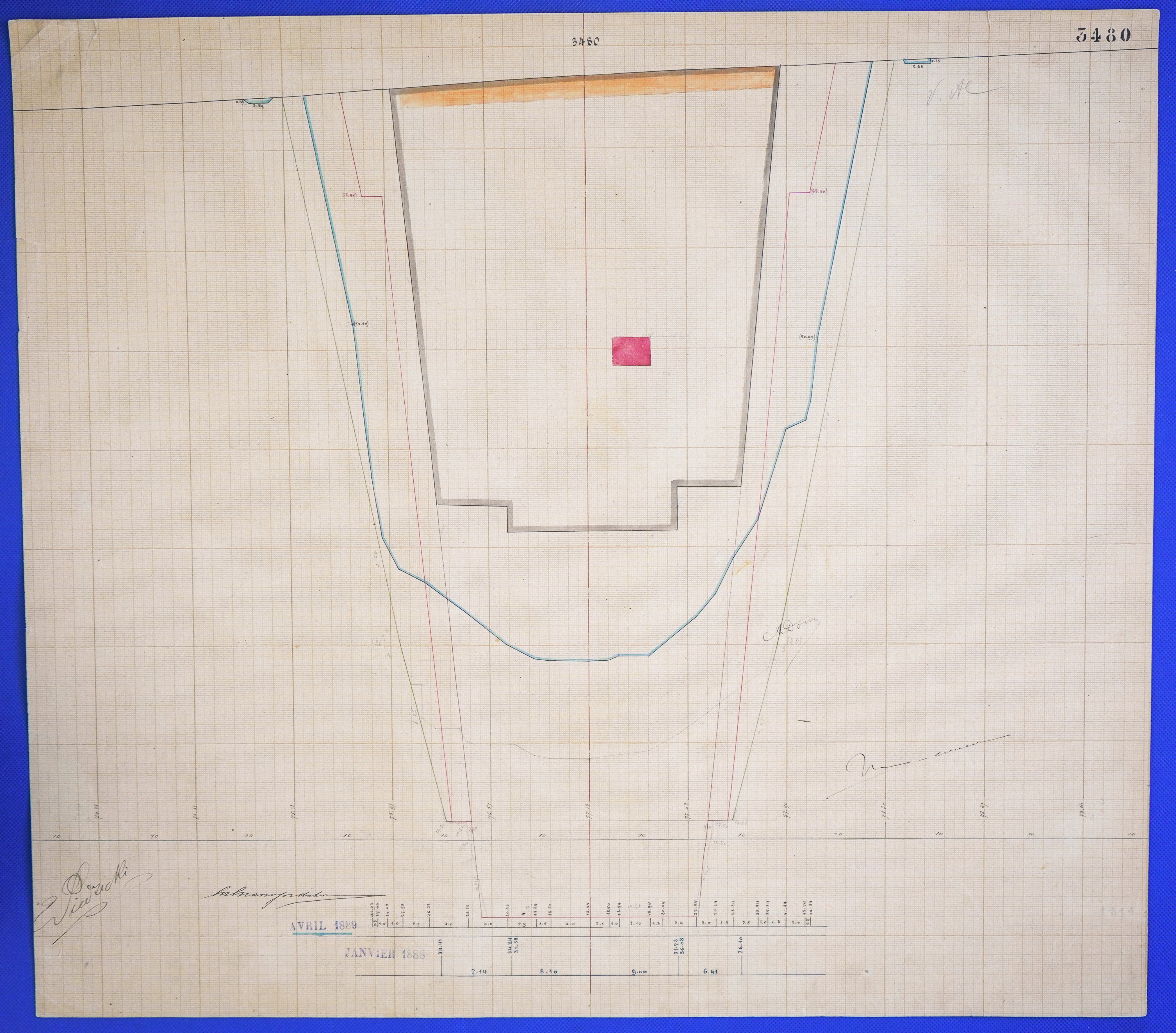 - Έγχρωμο σχέδιο προόδου εκσκαφικών εργασιών (μηκοτομή) χιλ. σημείου 3480 με μελάνι και έγχρωμο μολύβι σε χαρτί μιλιμετρέ.