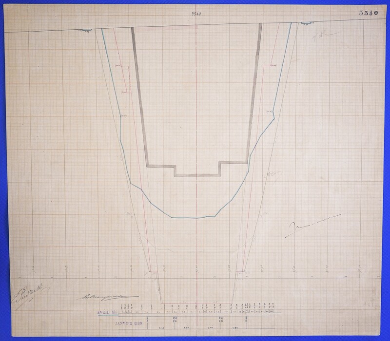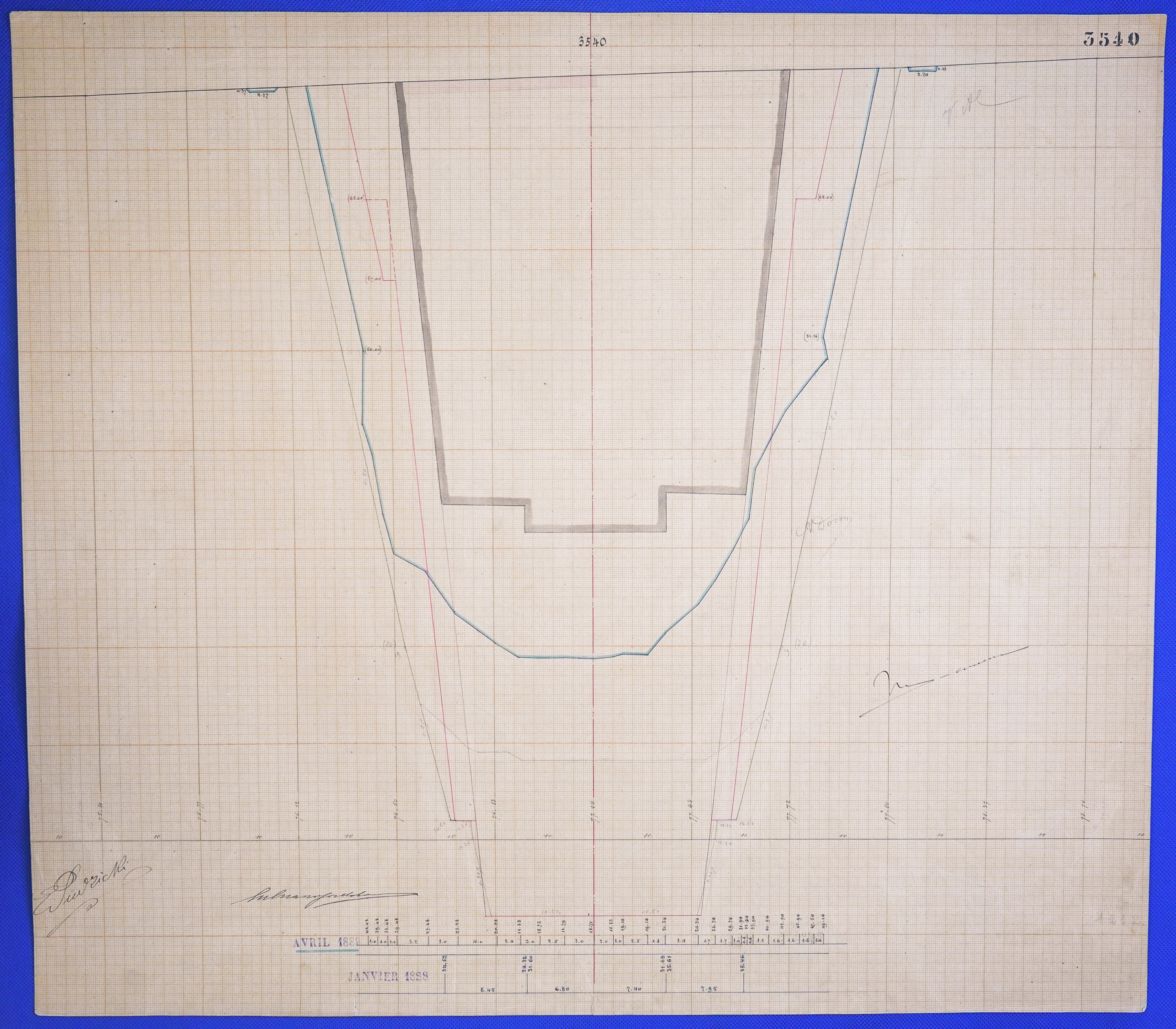 - Έγχρωμο σχέδιο προόδου εκσκαφικών εργασιών (μηκοτομή) χιλ. σημείου 3540 με μελάνι και έγχρωμο μολύβι σε χαρτί μιλιμετρέ.