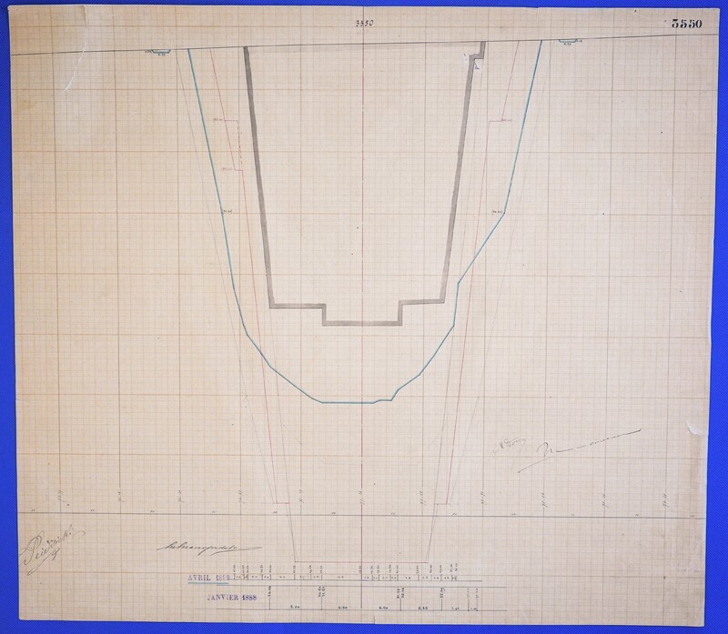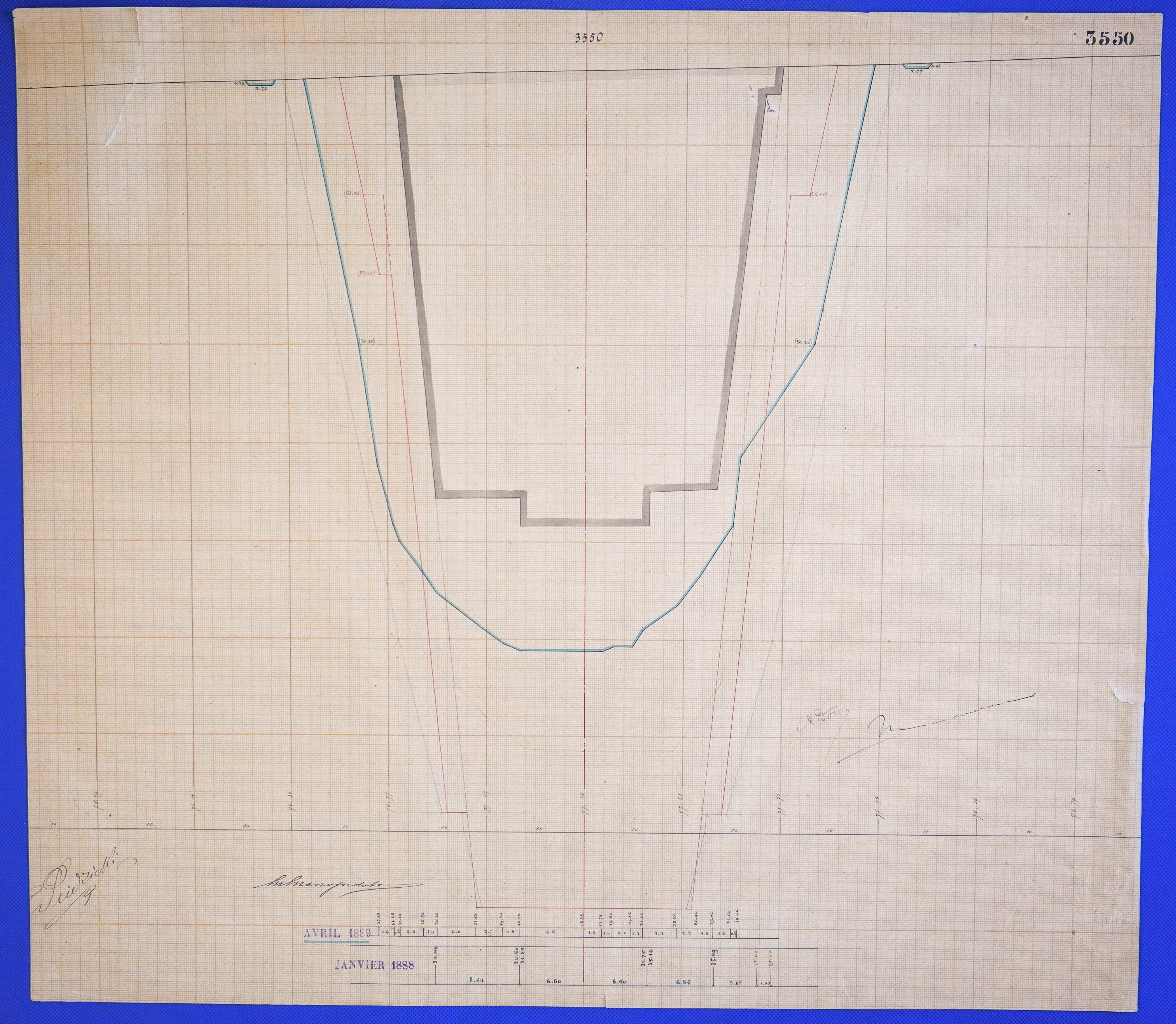 - Έγχρωμο σχέδιο προόδου εκσκαφικών εργασιών (μηκοτομή) χιλ. σημείου 3550 με μελάνι και έγχρωμο μολύβι σε χαρτί μιλιμετρέ.