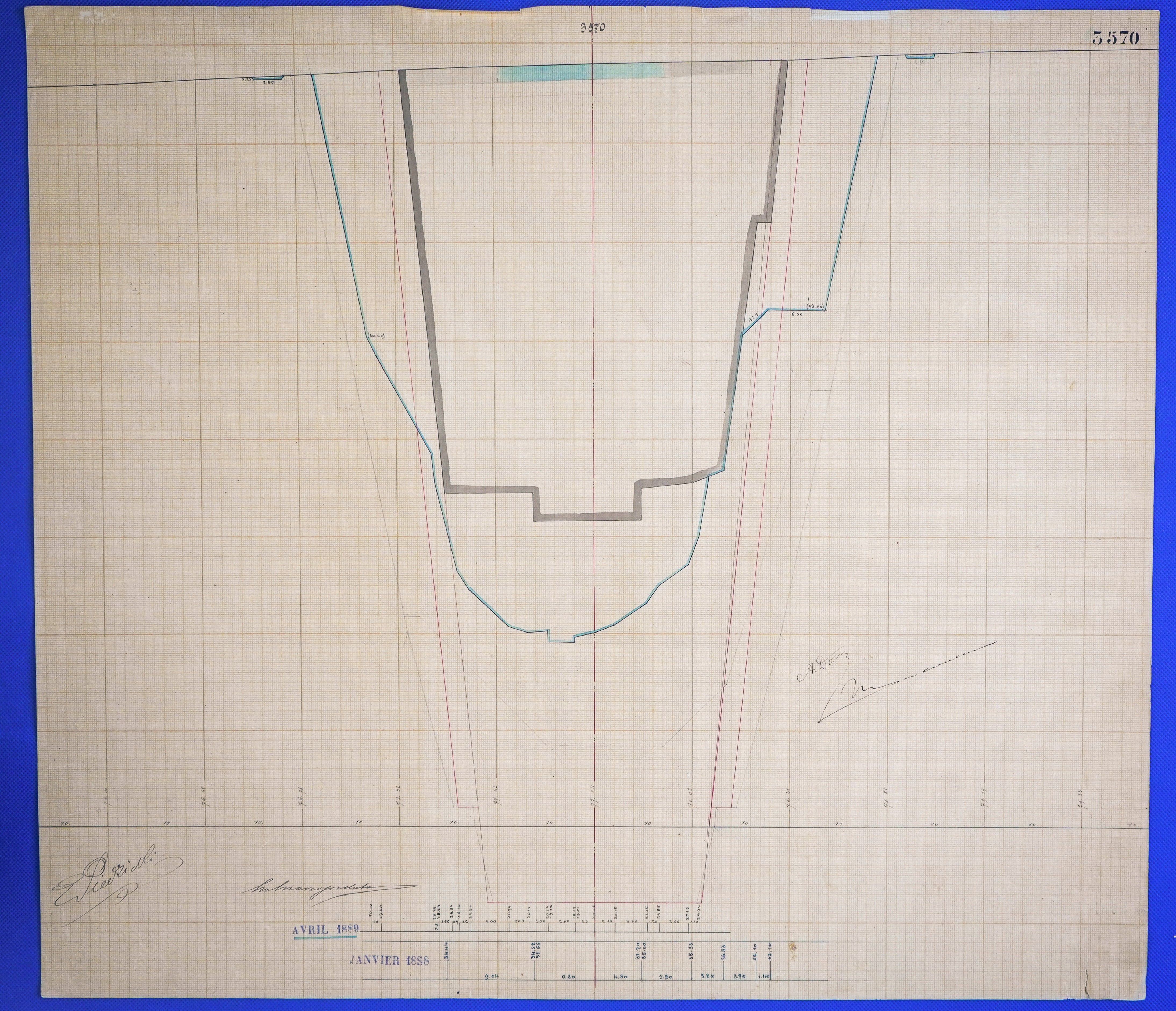 - Έγχρωμο σχέδιο προόδου εκσκαφικών εργασιών (μηκοτομή) χιλ. σημείου 3570 με μελάνι και έγχρωμο μολύβι σε χαρτί μιλιμετρέ.