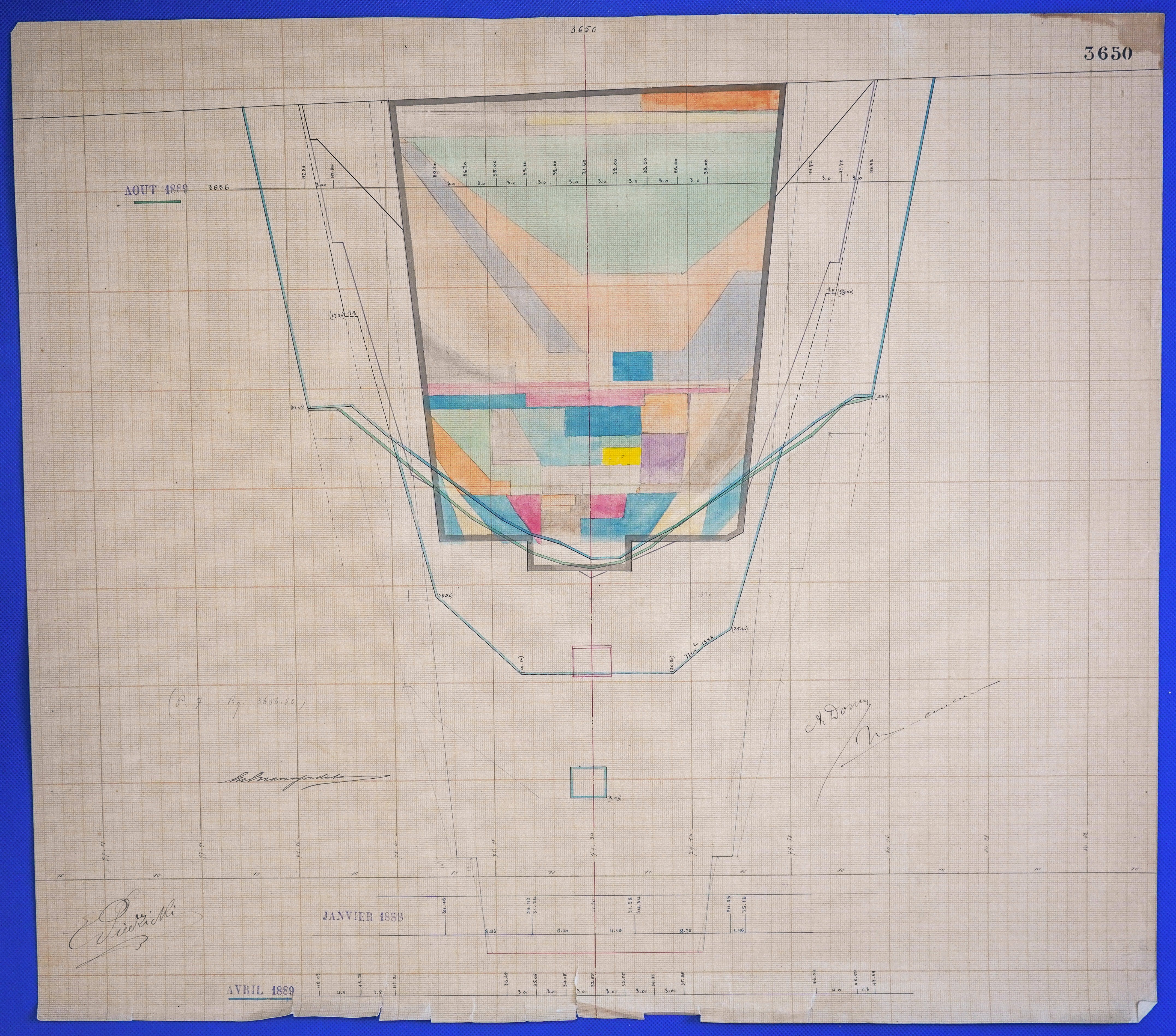 - Έγχρωμο σχέδιο προόδου εκσκαφικών εργασιών (μηκοτομή) χιλ. σημείου 3650 με μελάνι και έγχρωμο μολύβι σε χαρτί μιλιμετρέ.