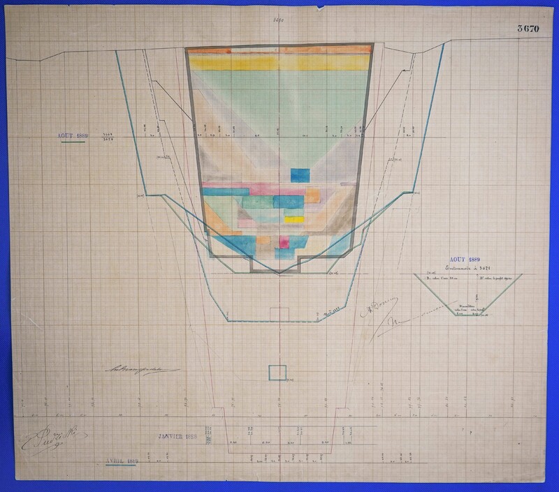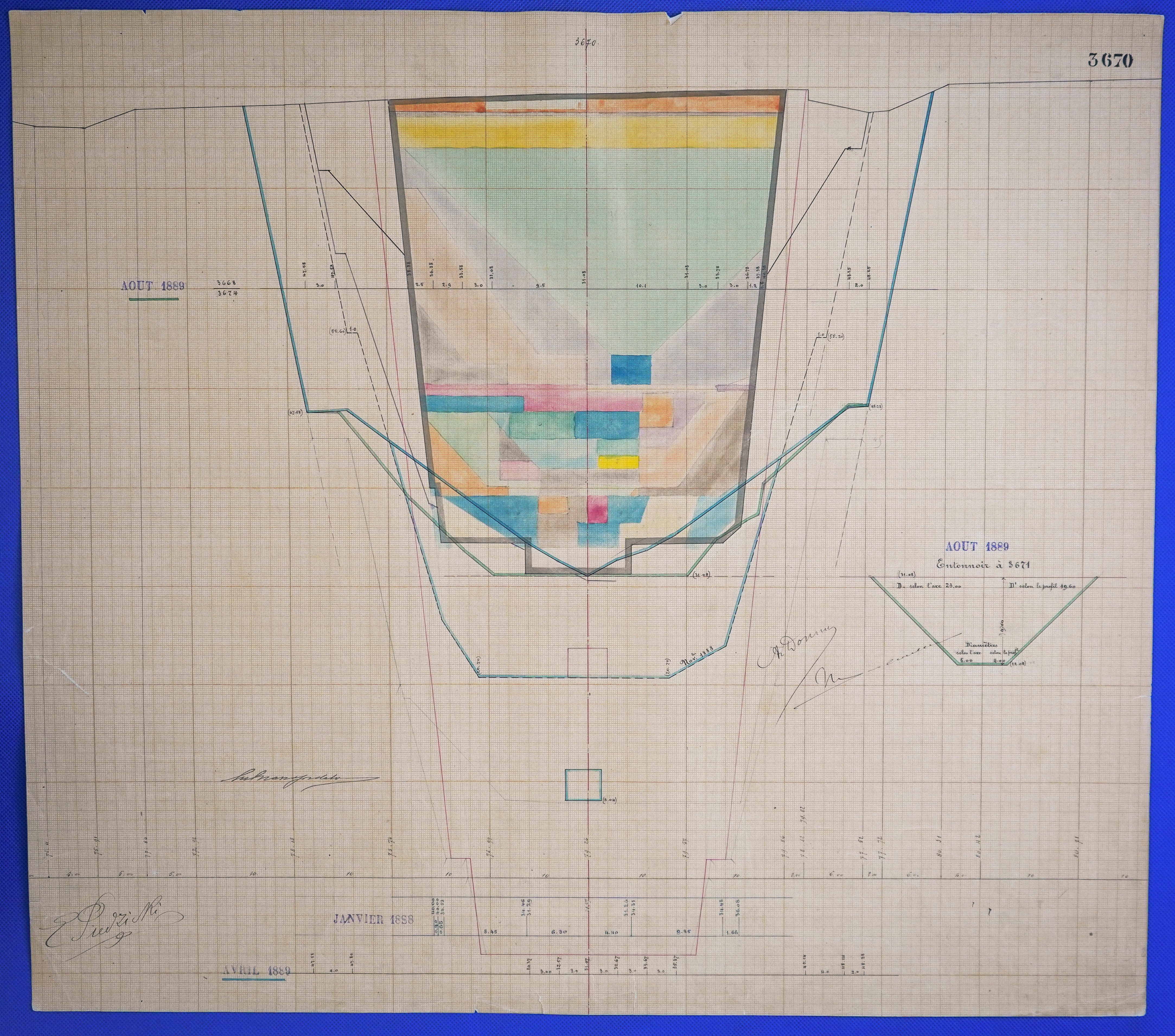 - Έγχρωμο σχέδιο προόδου εκσκαφικών εργασιών (μηκοτομή) χιλ. σημείου 3670 με μελάνι και έγχρωμο μολύβι σε χαρτί μιλιμετρέ.
