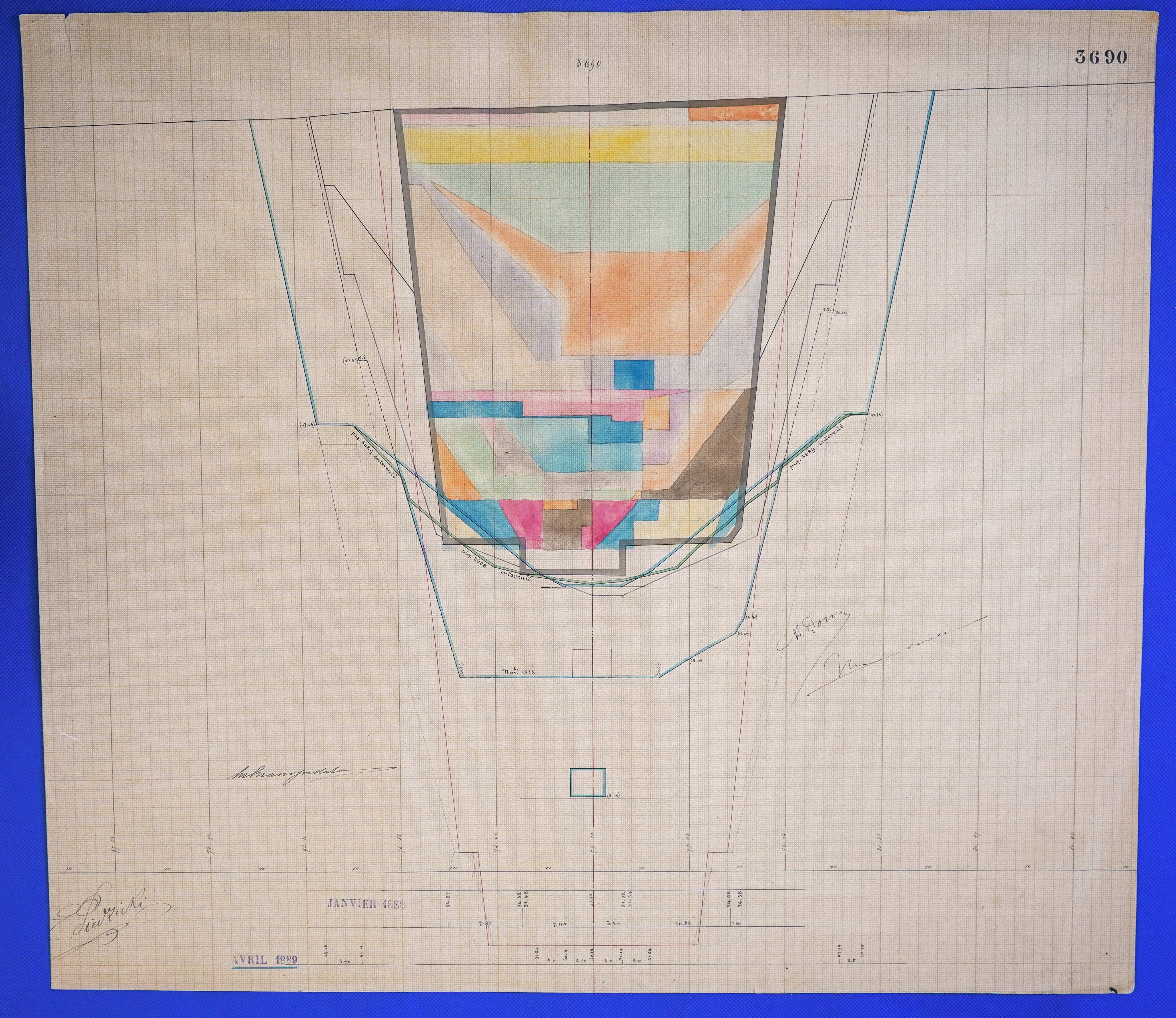 - Έγχρωμο σχέδιο προόδου εκσκαφικών εργασιών (μηκοτομή) χιλ. σημείου 3690 με μελάνι και έγχρωμο μολύβι σε χαρτί μιλιμετρέ.