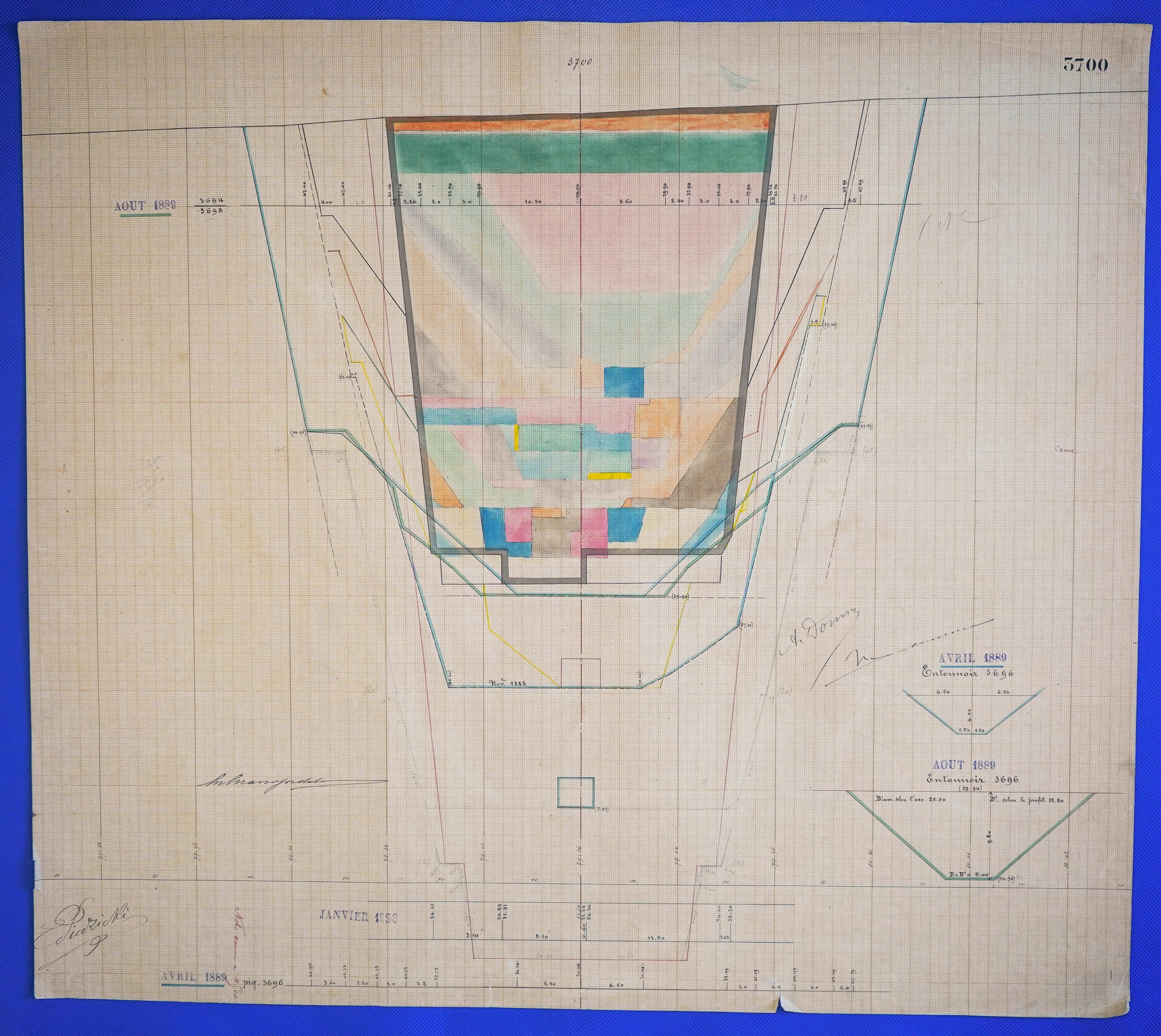 - Έγχρωμο σχέδιο προόδου εκσκαφικών εργασιών (μηκοτομή) χιλ. σημείου 3700 με μελάνι και έγχρωμο μολύβι σε χαρτί μιλιμετρέ.