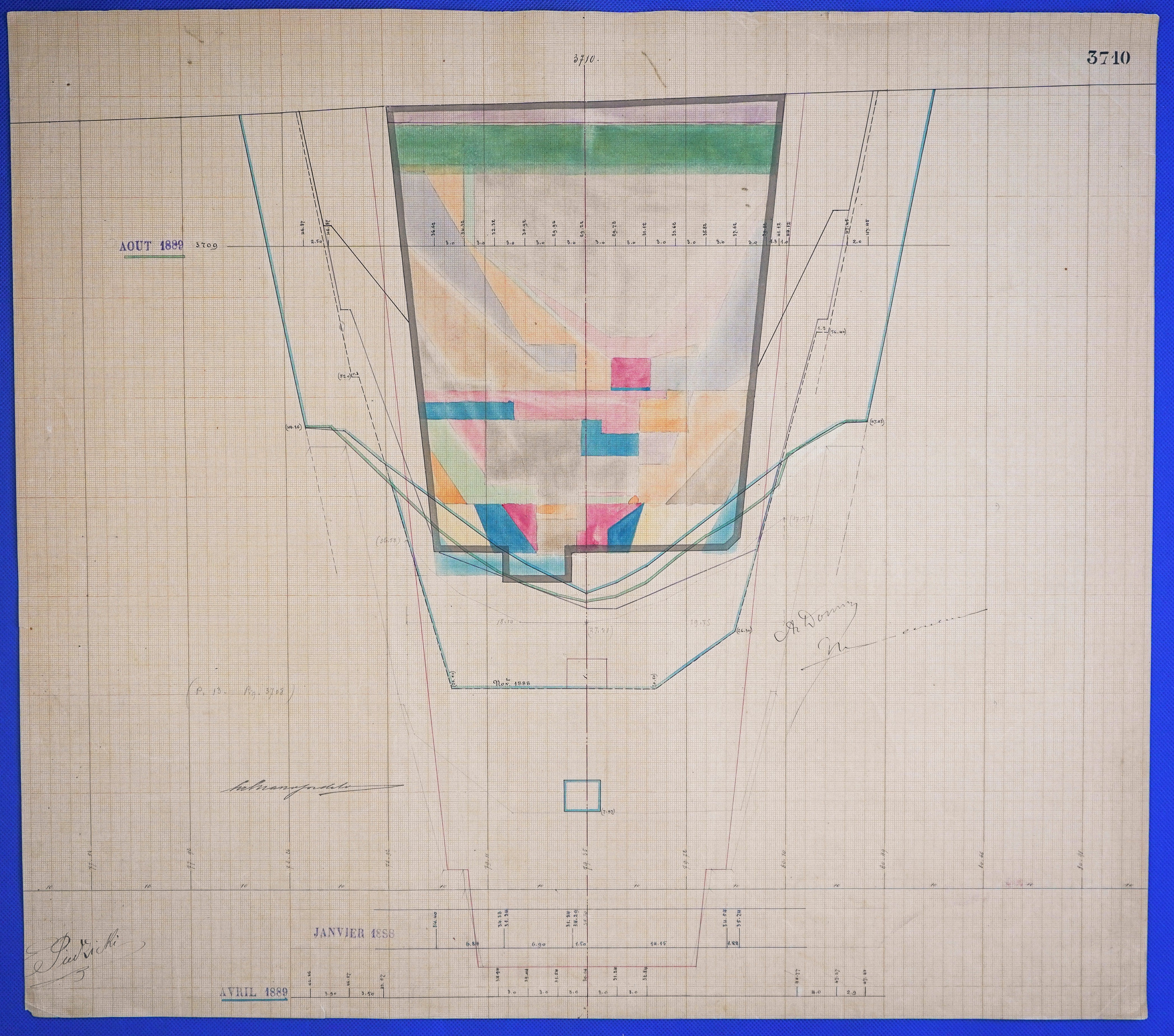 - Έγχρωμο σχέδιο προόδου εκσκαφικών εργασιών (μηκοτομή) χιλ. σημείου 3710 με μελάνι και έγχρωμο μολύβι σε χαρτί μιλιμετρέ.