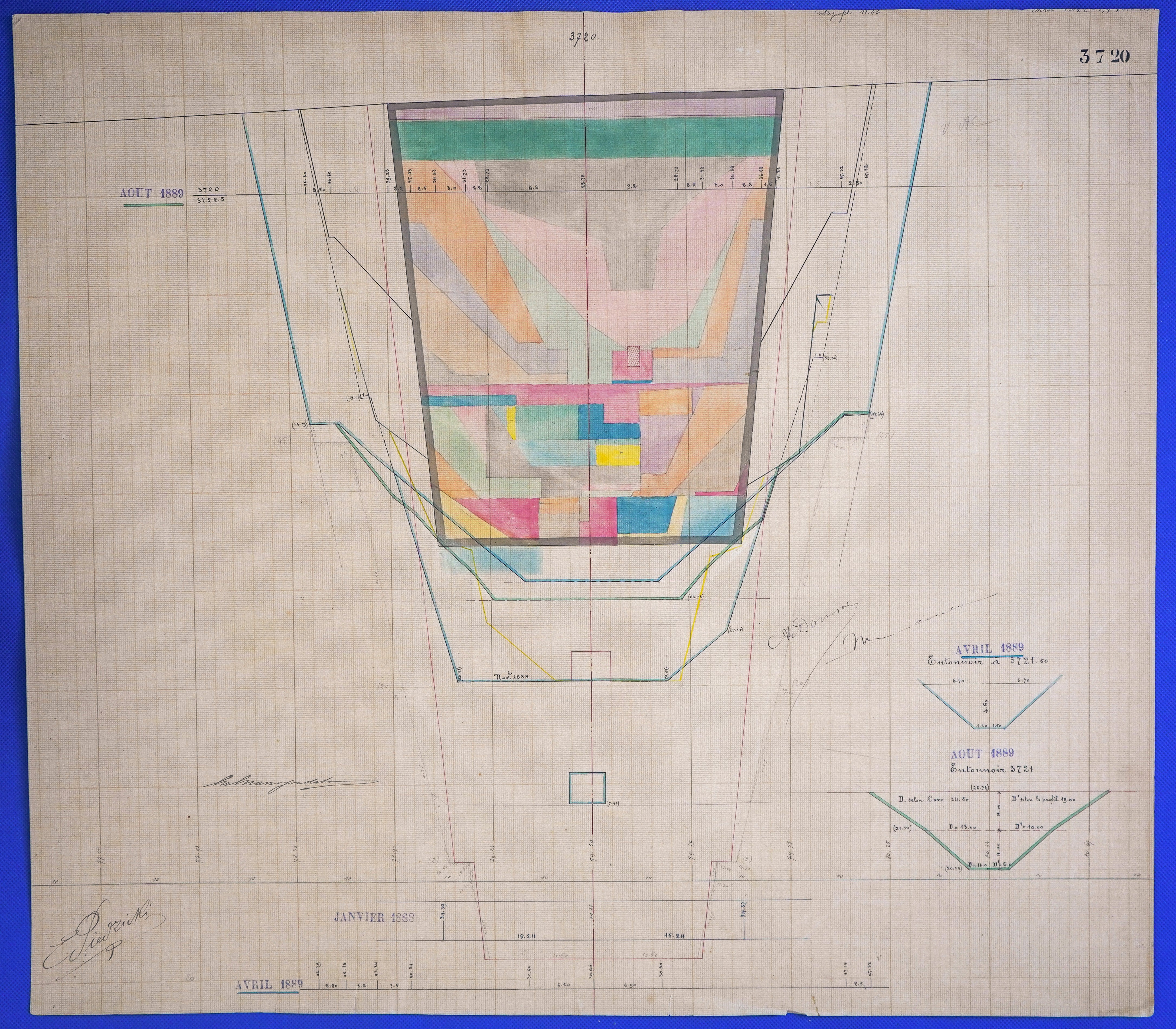 - Έγχρωμο σχέδιο προόδου εκσκαφικών εργασιών (μηκοτομή) χιλ. σημείου 3720 με μελάνι και έγχρωμο μολύβι σε χαρτί μιλιμετρέ.