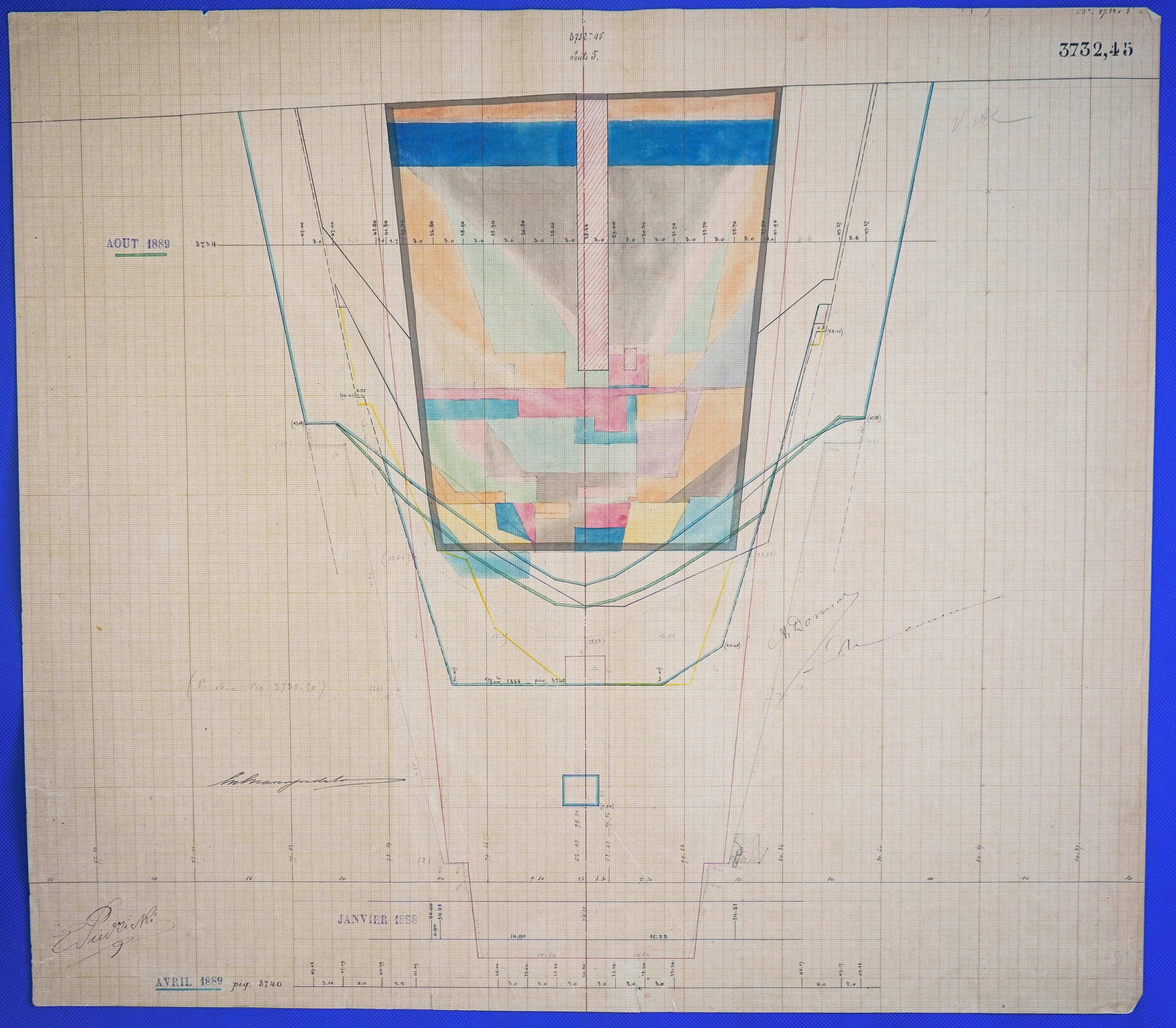 - Έγχρωμο σχέδιο προόδου εκσκαφικών εργασιών (μηκοτομή) χιλ. σημείου 3732,45 με μελάνι και έγχρωμο μολύβι σε χαρτί μιλιμετρέ.