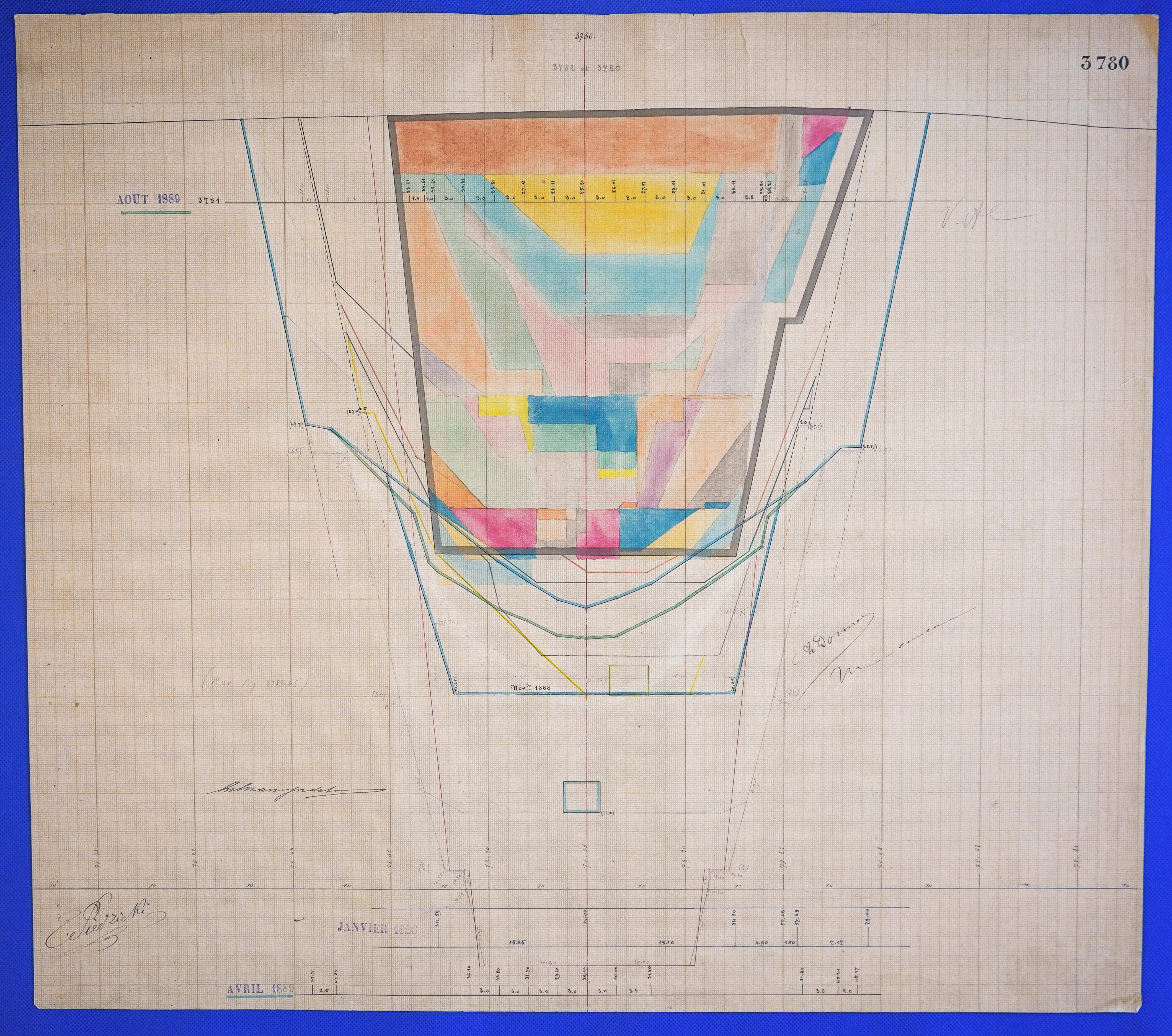 - Έγχρωμο σχέδιο προόδου εκσκαφικών εργασιών (μηκοτομή) χιλ. σημείου 3780 με μελάνι και έγχρωμο μολύβι σε χαρτί μιλιμετρέ.