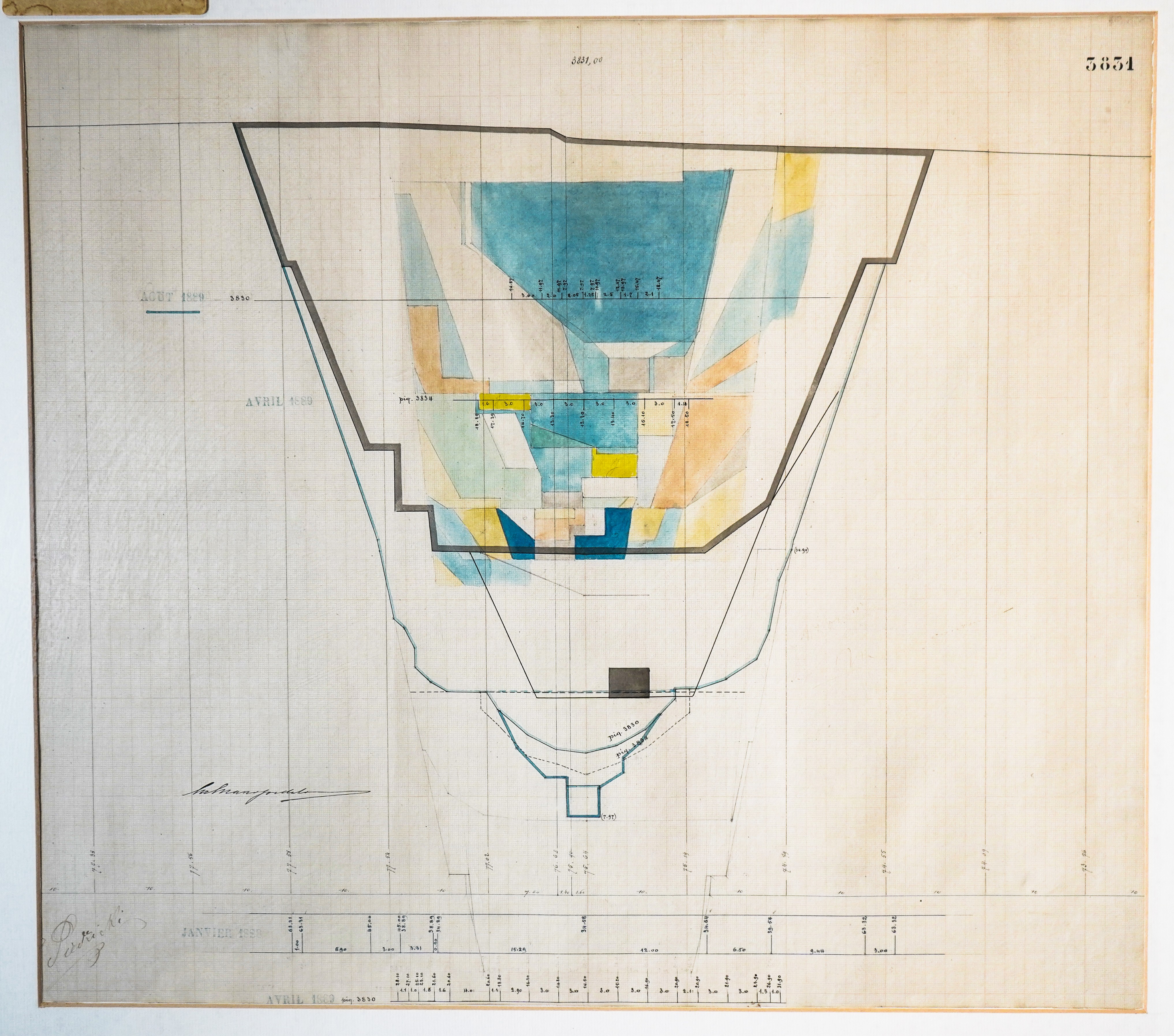 - Έγχρωμο σχέδιο προόδου εκσκαφικών εργασιών (μηκοτομή) χιλ. σημείου 3831 με μελάνι και έγχρωμο μολύβι σε χαρτί μιλιμετρέ.