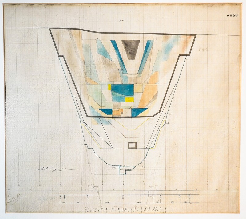 - Έγχρωμο σχέδιο προόδου εκσκαφικών εργασιών (μηκοτομή) χιλ. σημείου 3840 με μελάνι και έγχρωμο μολύβι σε χαρτί μιλιμετρέ.
