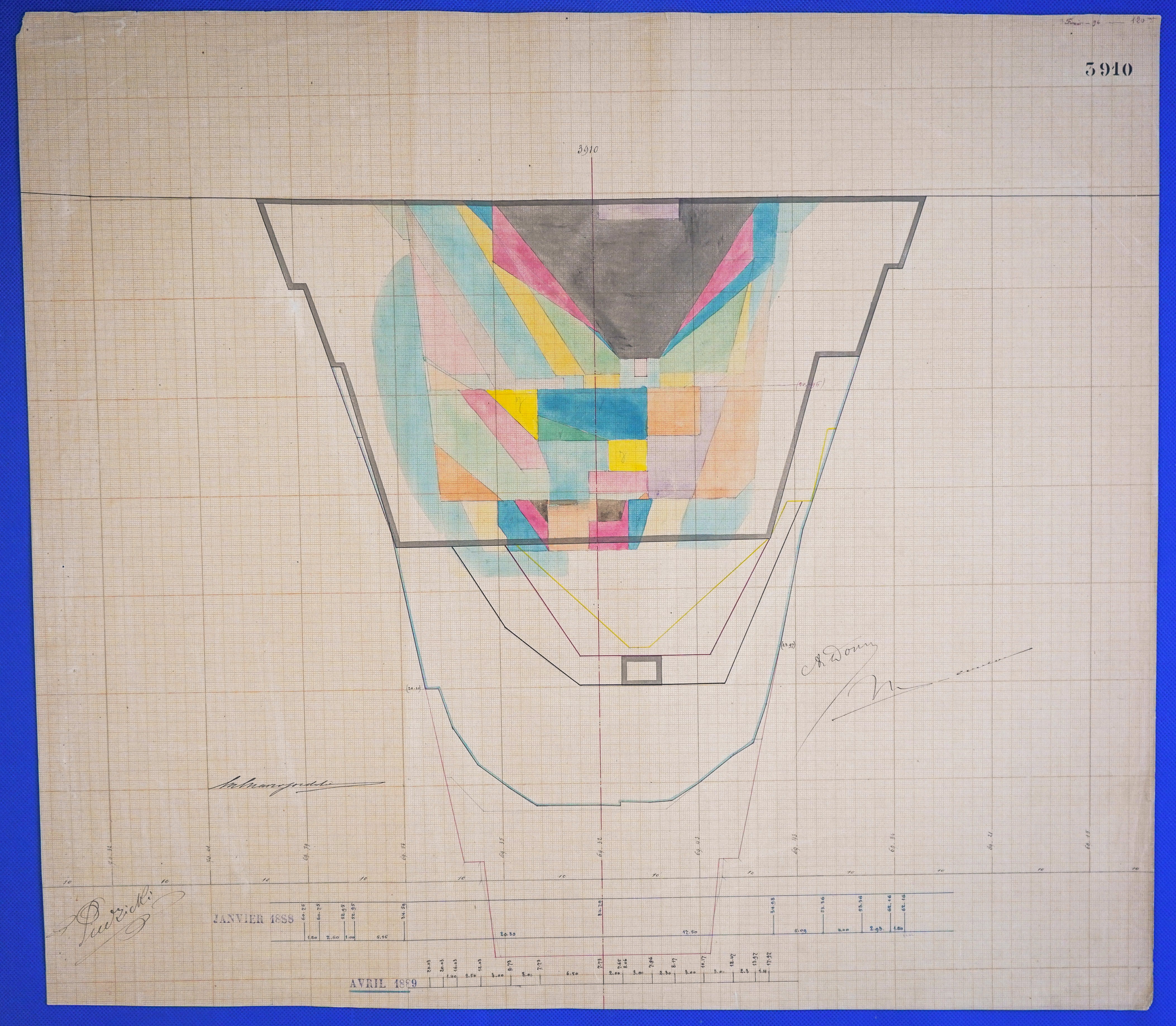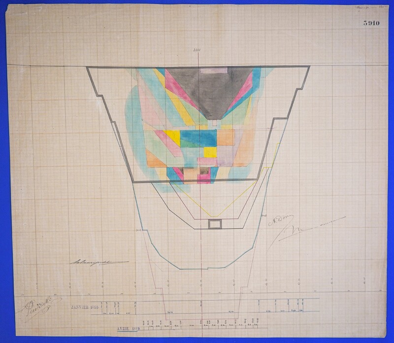 - Έγχρωμο σχέδιο προόδου εκσκαφικών εργασιών (μηκοτομή) χιλ. σημείου 3910 με μελάνι και έγχρωμο μολύβι σε χαρτί μιλιμετρέ.
