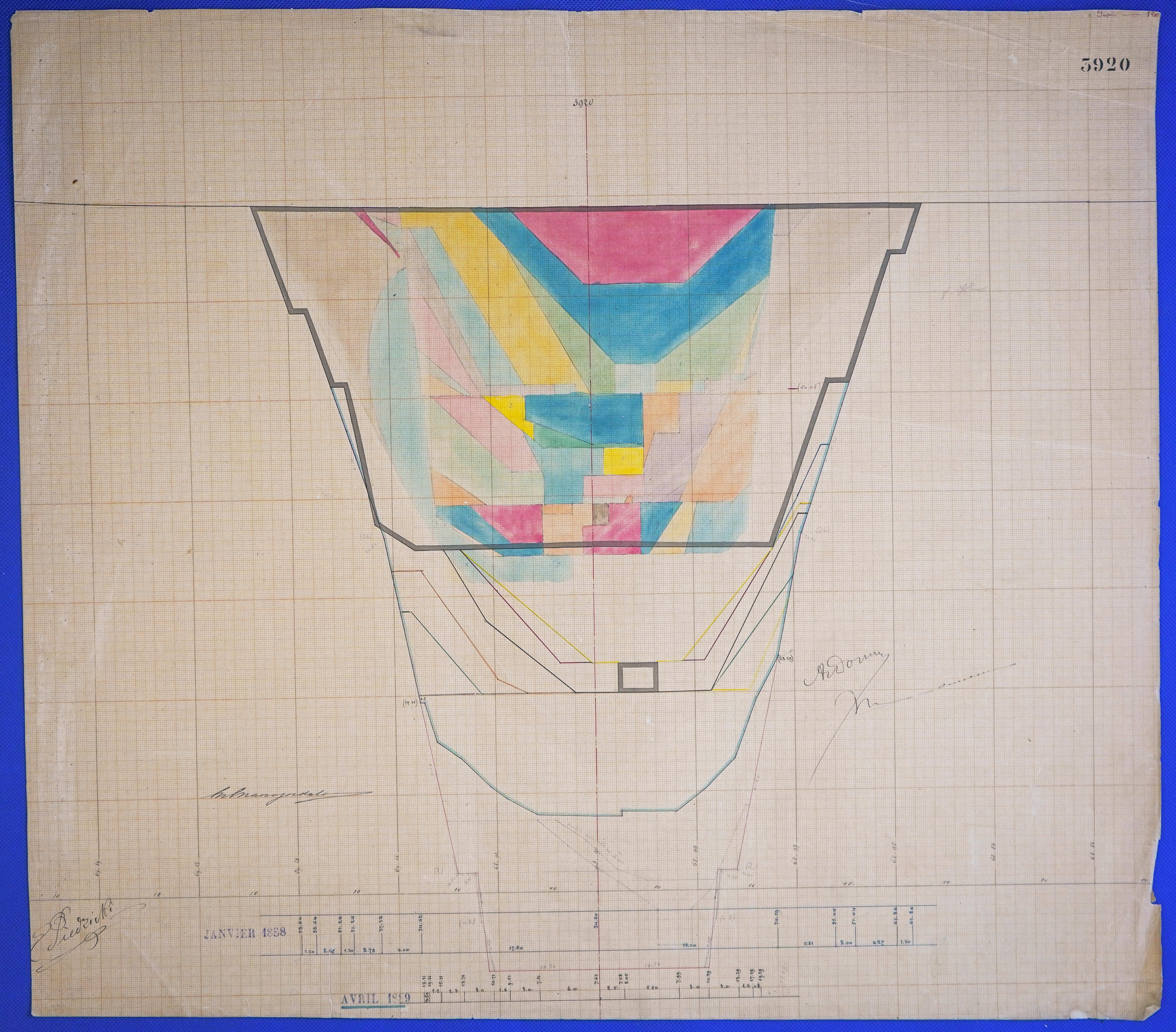- Έγχρωμο σχέδιο προόδου εκσκαφικών εργασιών (μηκοτομή) χιλ. σημείου 3920 με μελάνι και έγχρωμο μολύβι σε χαρτί μιλιμετρέ.