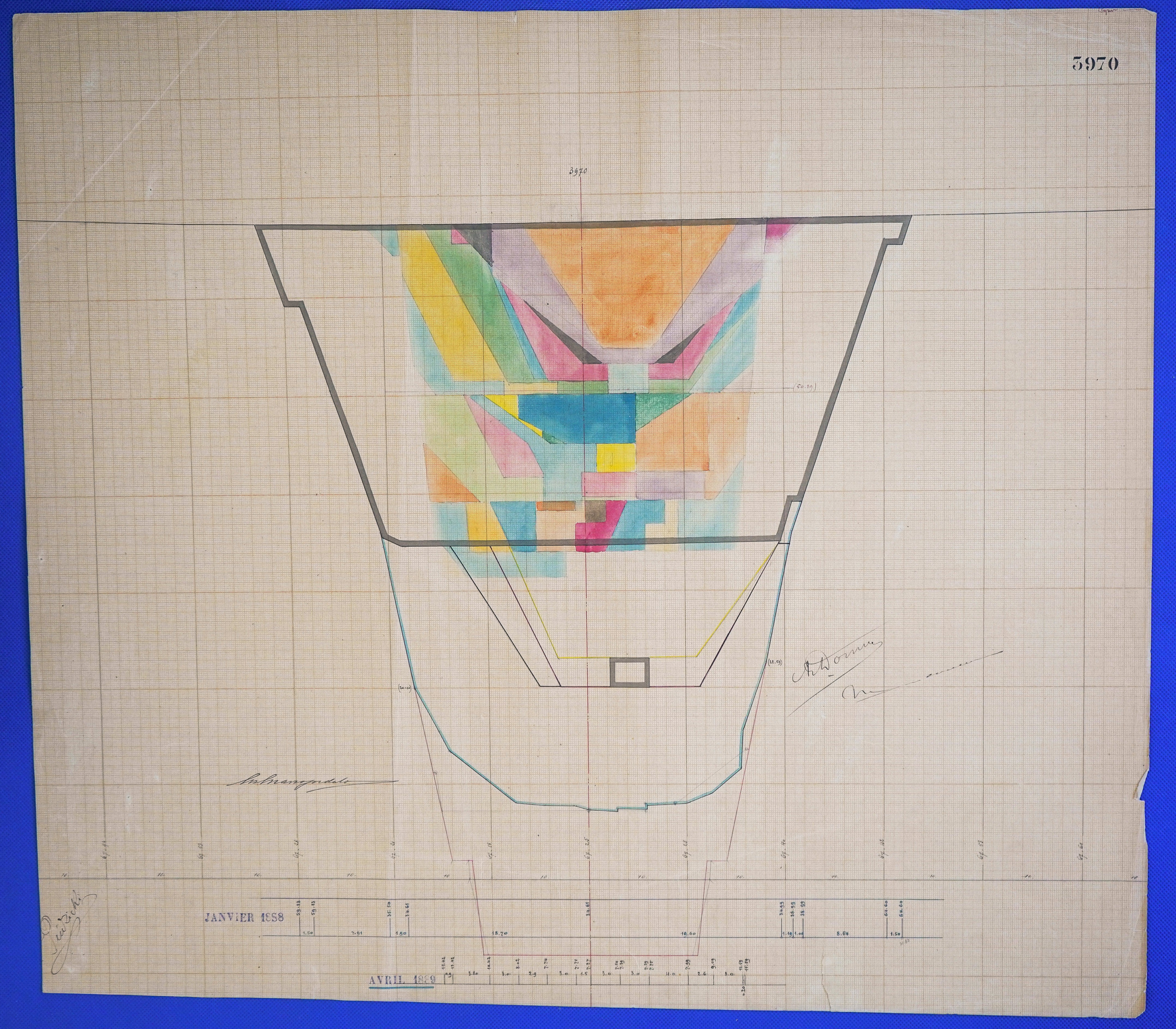 - Έγχρωμο σχέδιο προόδου εκσκαφικών εργασιών (μηκοτομή) χιλ. σημείου 3970 με μελάνι και έγχρωμο μολύβι σε χαρτί μιλιμετρέ.