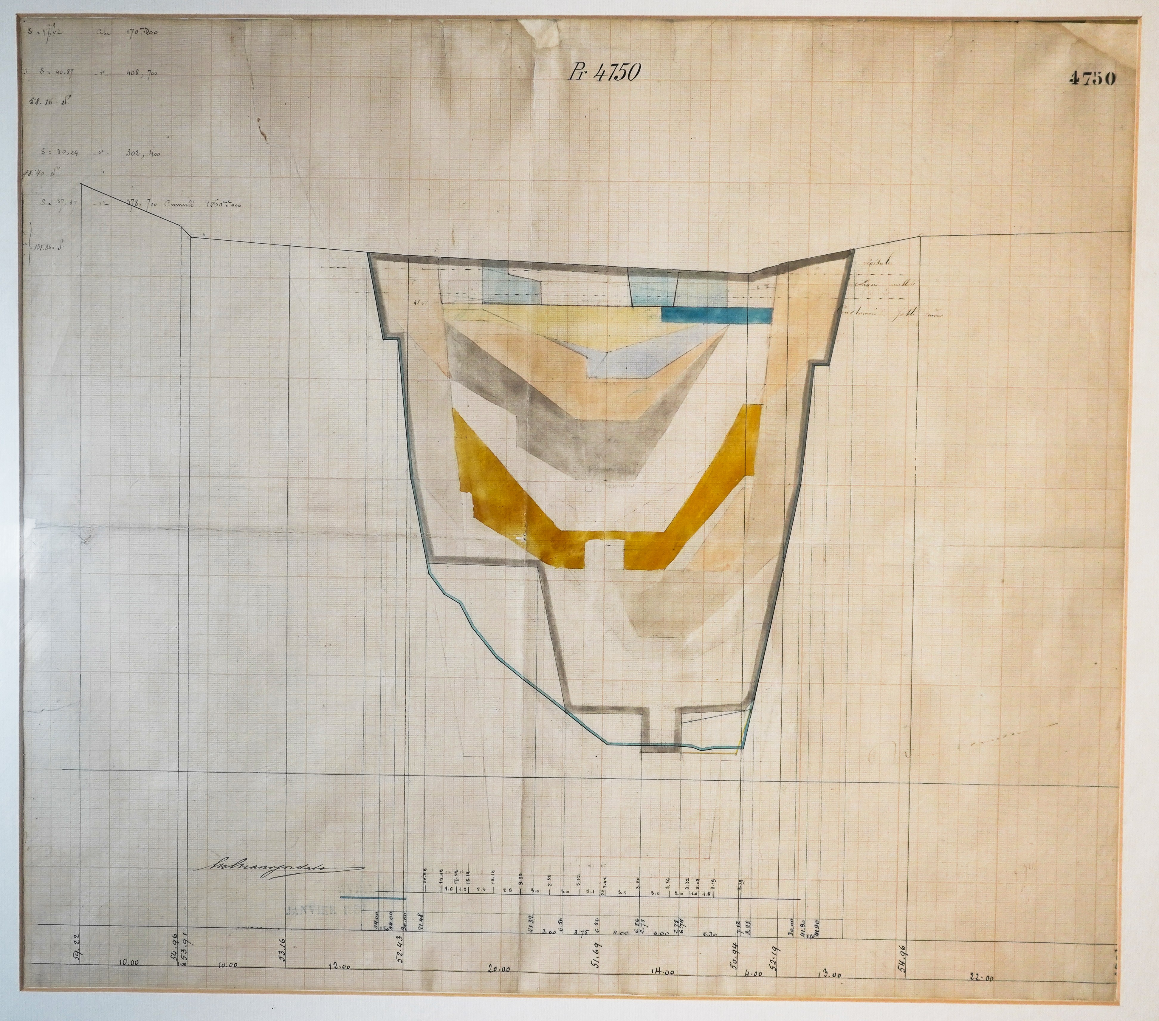 - Έγχρωμο σχέδιο προόδου εκσκαφικών εργασιών (μηκοτομή) χιλ. σημείου 4750 με μελάνι και έγχρωμο μολύβι σε χαρτί μιλιμετρέ.