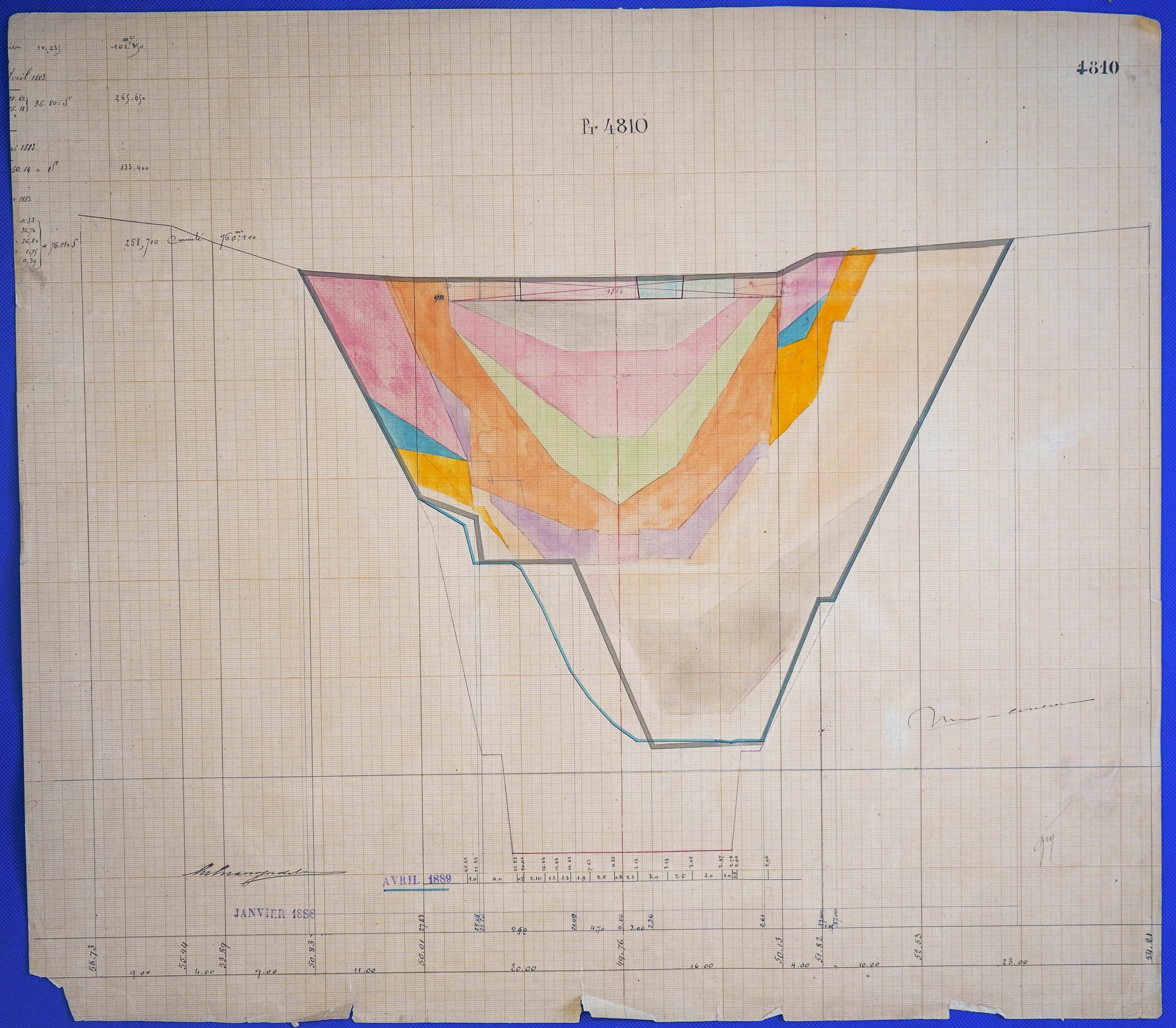 - Έγχρωμο σχέδιο προόδου εκσκαφικών εργασιών (μηκοτομή) χιλ. σημείου 4810 με μελάνι και έγχρωμο μολύβι σε χαρτί μιλιμετρέ.