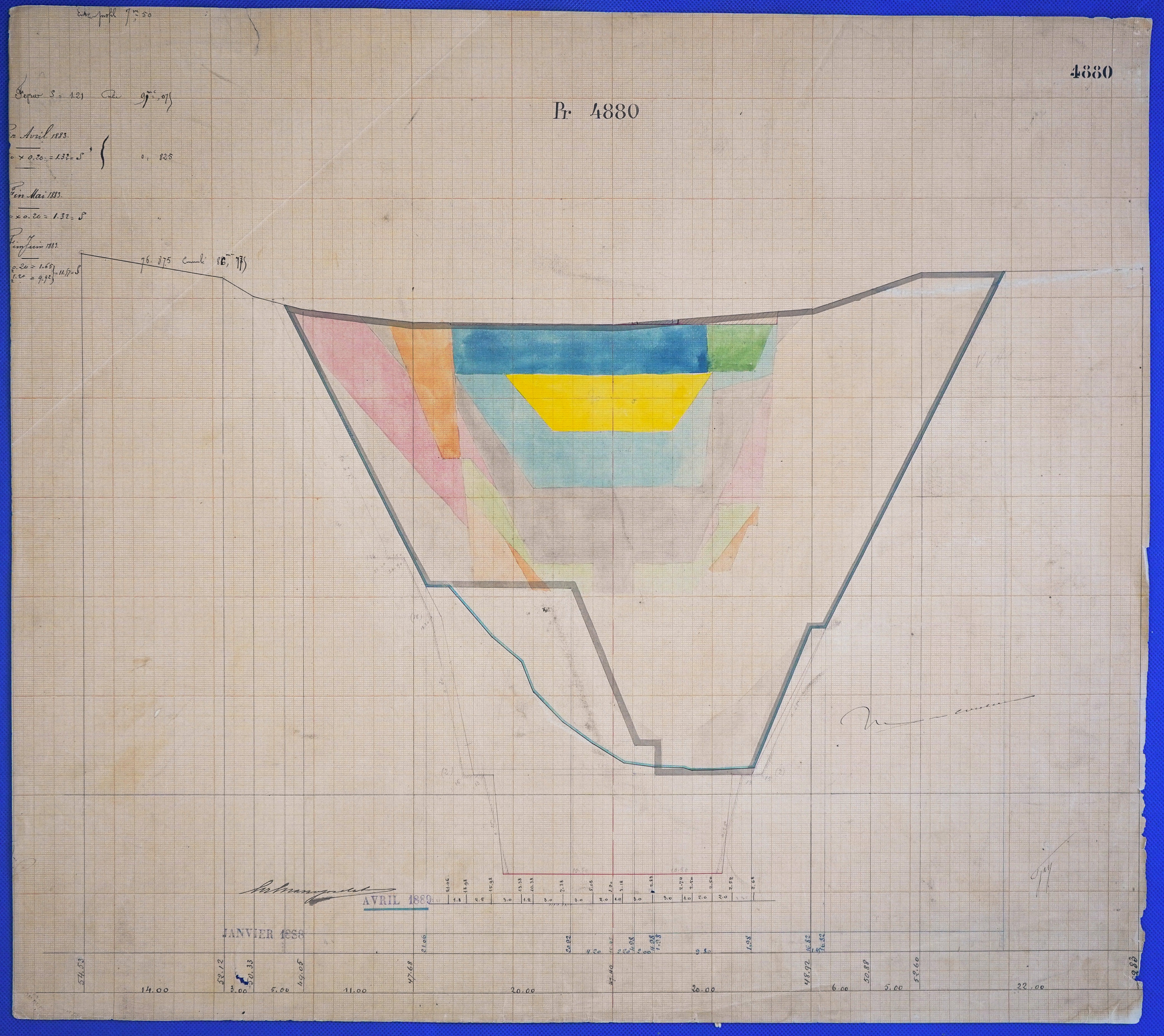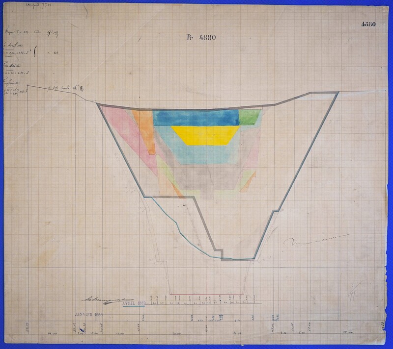 - Έγχρωμο σχέδιο προόδου εκσκαφικών εργασιών (μηκοτομή) χιλ. σημείου 4880 με μελάνι και έγχρωμο μολύβι σε χαρτί μιλιμετρέ.