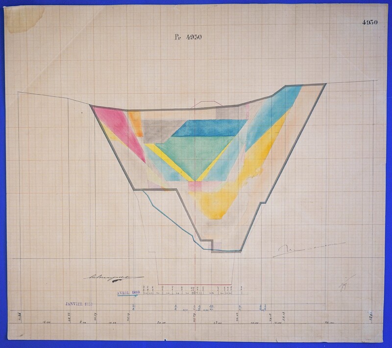 - Έγχρωμο σχέδιο προόδου εκσκαφικών εργασιών (μηκοτομή) χιλ. σημείου 4930 με μελάνι και έγχρωμο μολύβι σε χαρτί μιλιμετρέ.
