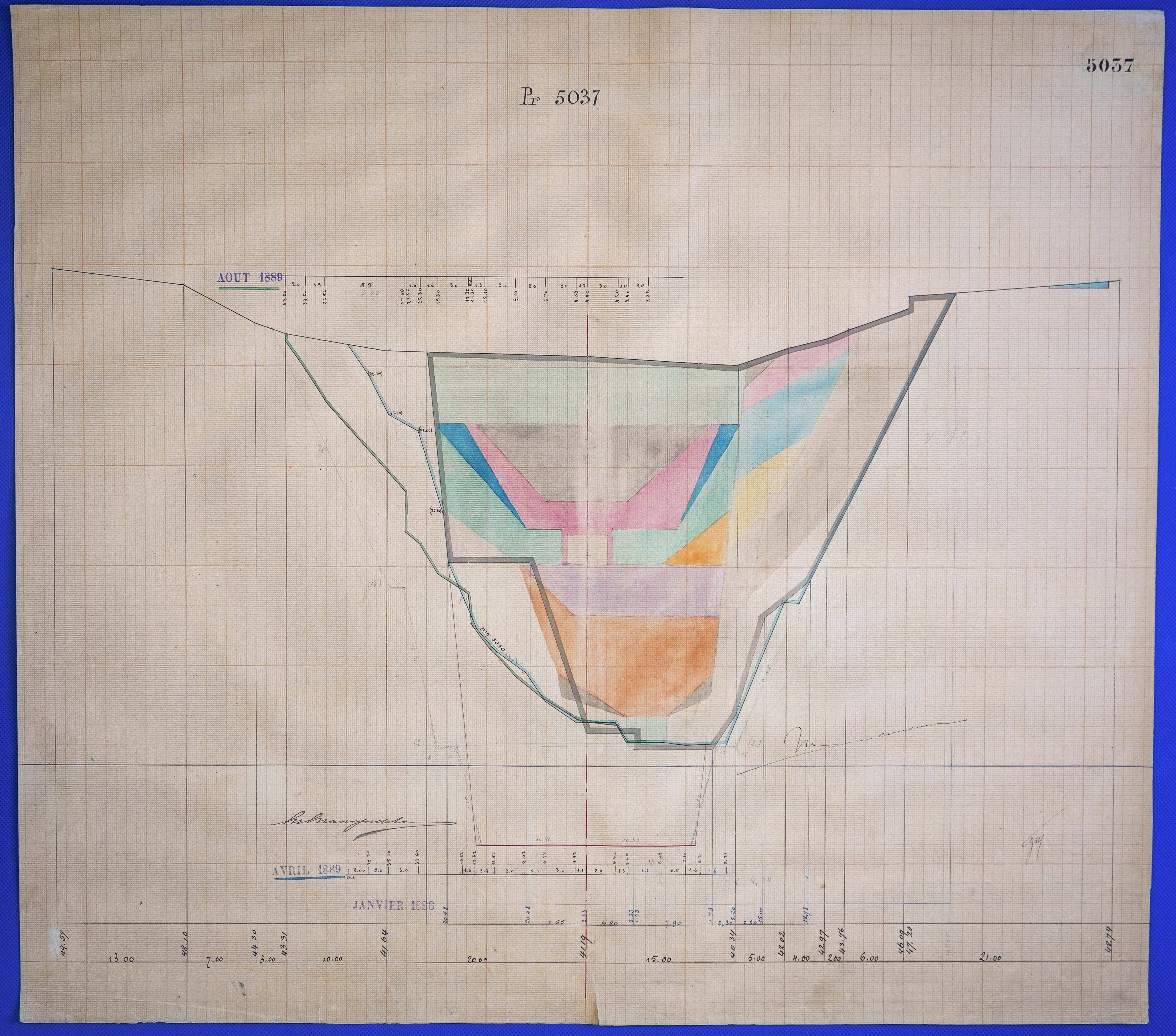 - Έγχρωμο σχέδιο προόδου εκσκαφικών εργασιών (μηκοτομή) χιλ. σημείου 5037 με μελάνι και έγχρωμο μολύβι σε χαρτί μιλιμετρέ.