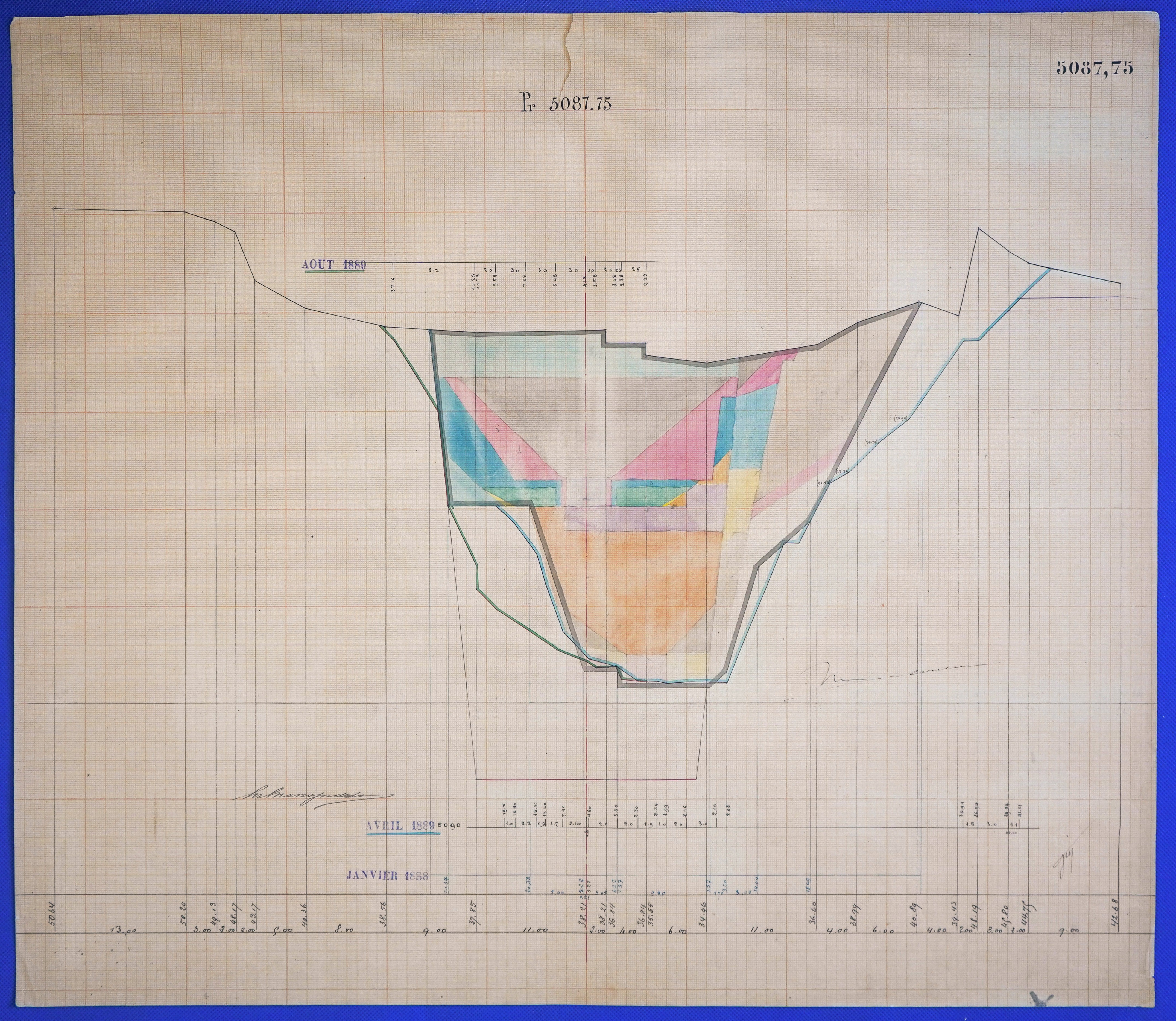 - Έγχρωμο σχέδιο προόδου εκσκαφικών εργασιών (μηκοτομή) χιλ. σημείου 5087,75 με μελάνι και έγχρωμο μολύβι σε χαρτί μιλιμετρέ.