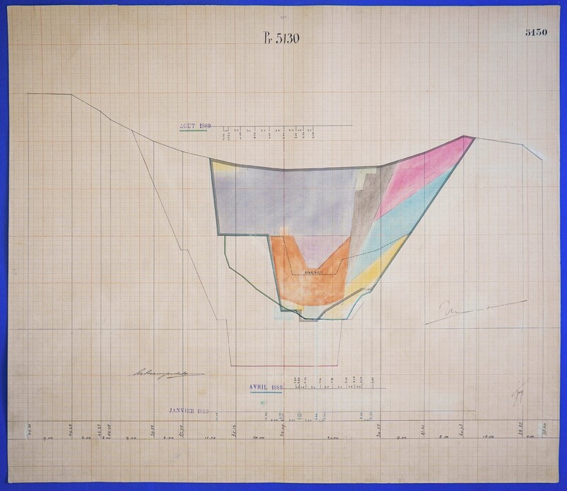 - Έγχρωμο σχέδιο προόδου εκσκαφικών εργασιών (μηκοτομή) χιλ. σημείου 5130 με μελάνι και έγχρωμο μολύβι σε χαρτί μιλιμετρέ.