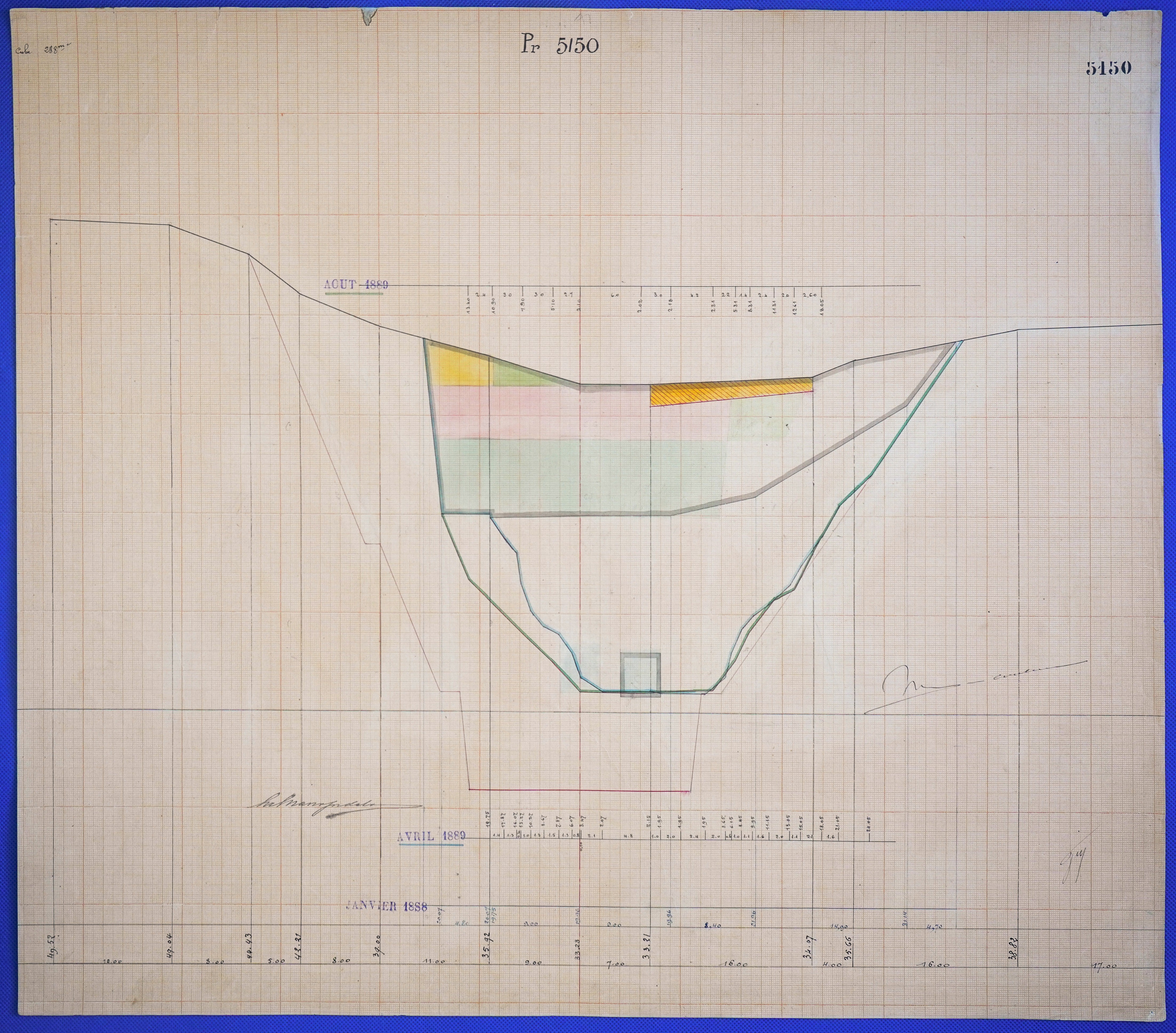 - Έγχρωμο σχέδιο προόδου εκσκαφικών εργασιών (μηκοτομή) χιλ. σημείου 5150 με μελάνι και έγχρωμο μολύβι σε χαρτί μιλιμετρέ.
