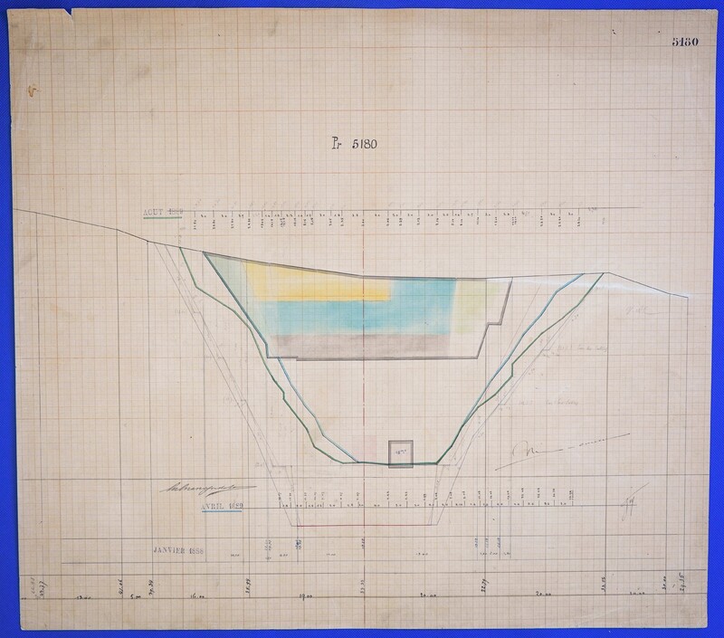 - Έγχρωμο σχέδιο προόδου εκσκαφικών εργασιών (μηκοτομή) χιλ. σημείου 5180 με μελάνι και έγχρωμο μολύβι σε χαρτί μιλιμετρέ.