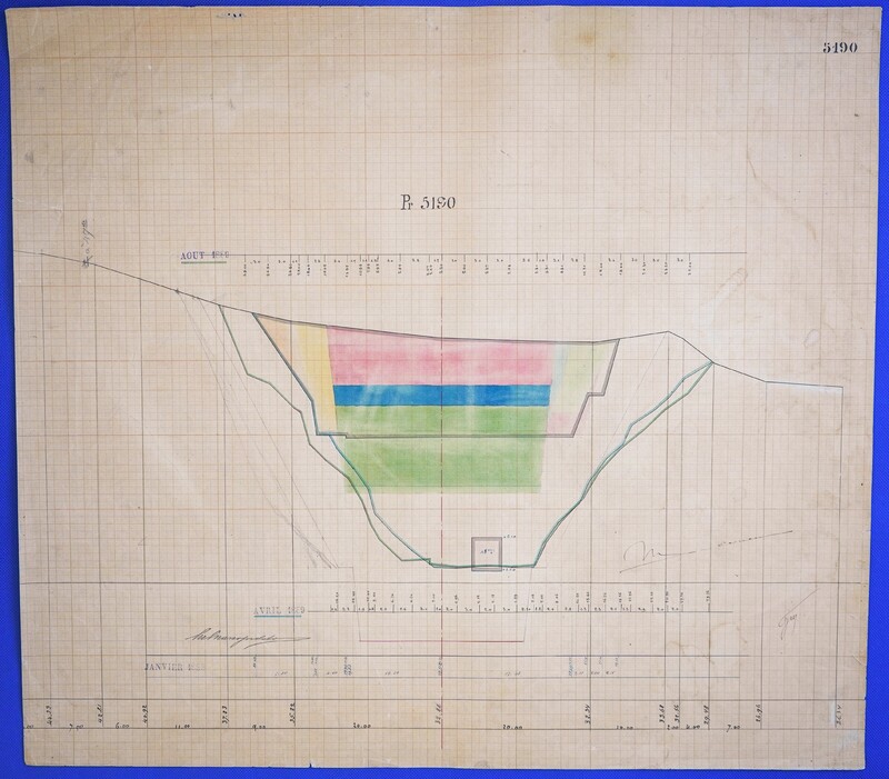 - Έγχρωμο σχέδιο προόδου εκσκαφικών εργασιών (μηκοτομή) χιλ. σημείου 5190 με μελάνι και έγχρωμο μολύβι σε χαρτί μιλιμετρέ.