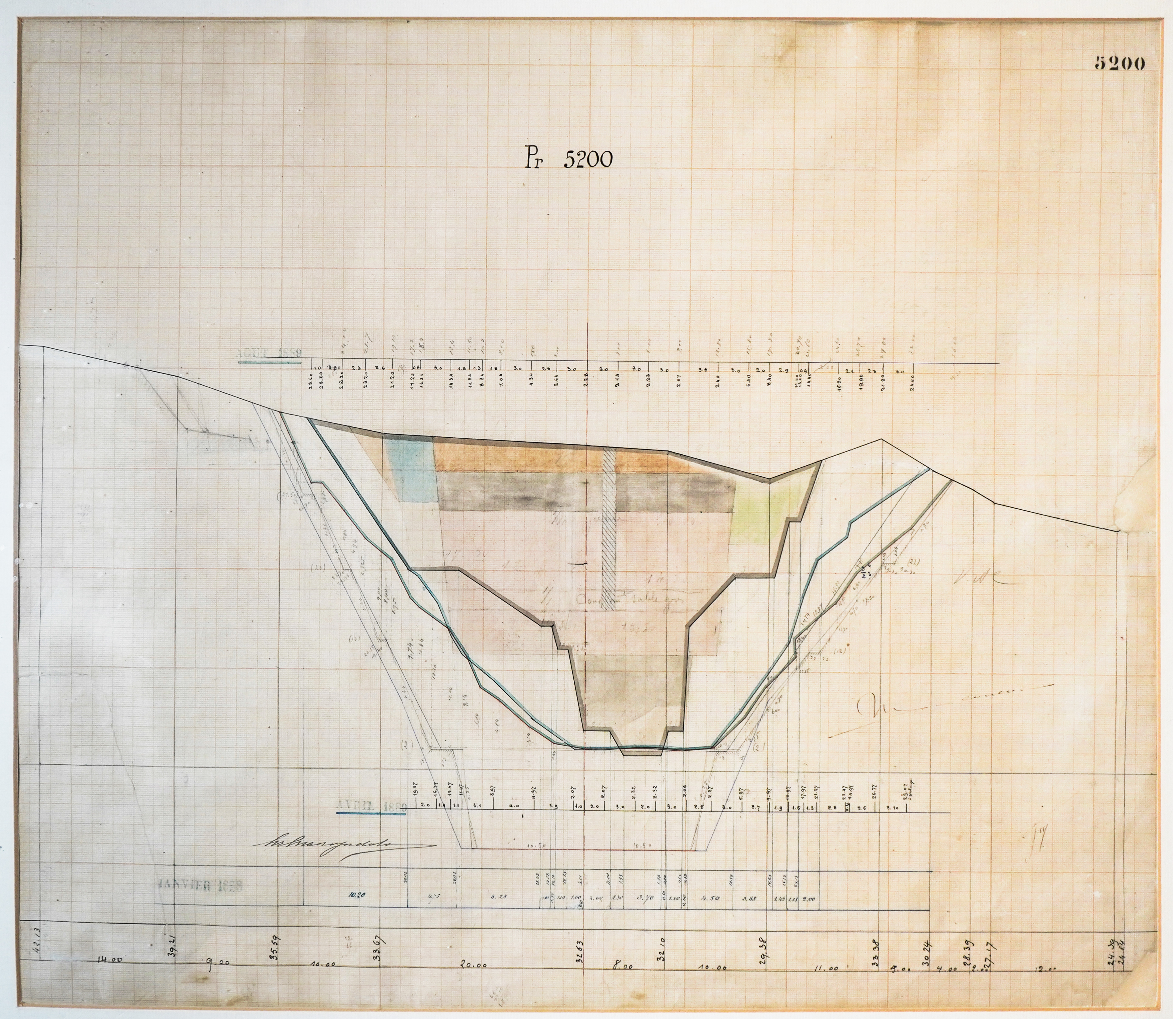 - Έγχρωμο σχέδιο προόδου εκσκαφικών εργασιών (μηκοτομή) χιλ. σημείου 5200 με μελάνι και έγχρωμο μολύβι σε χαρτί μιλιμετρέ.