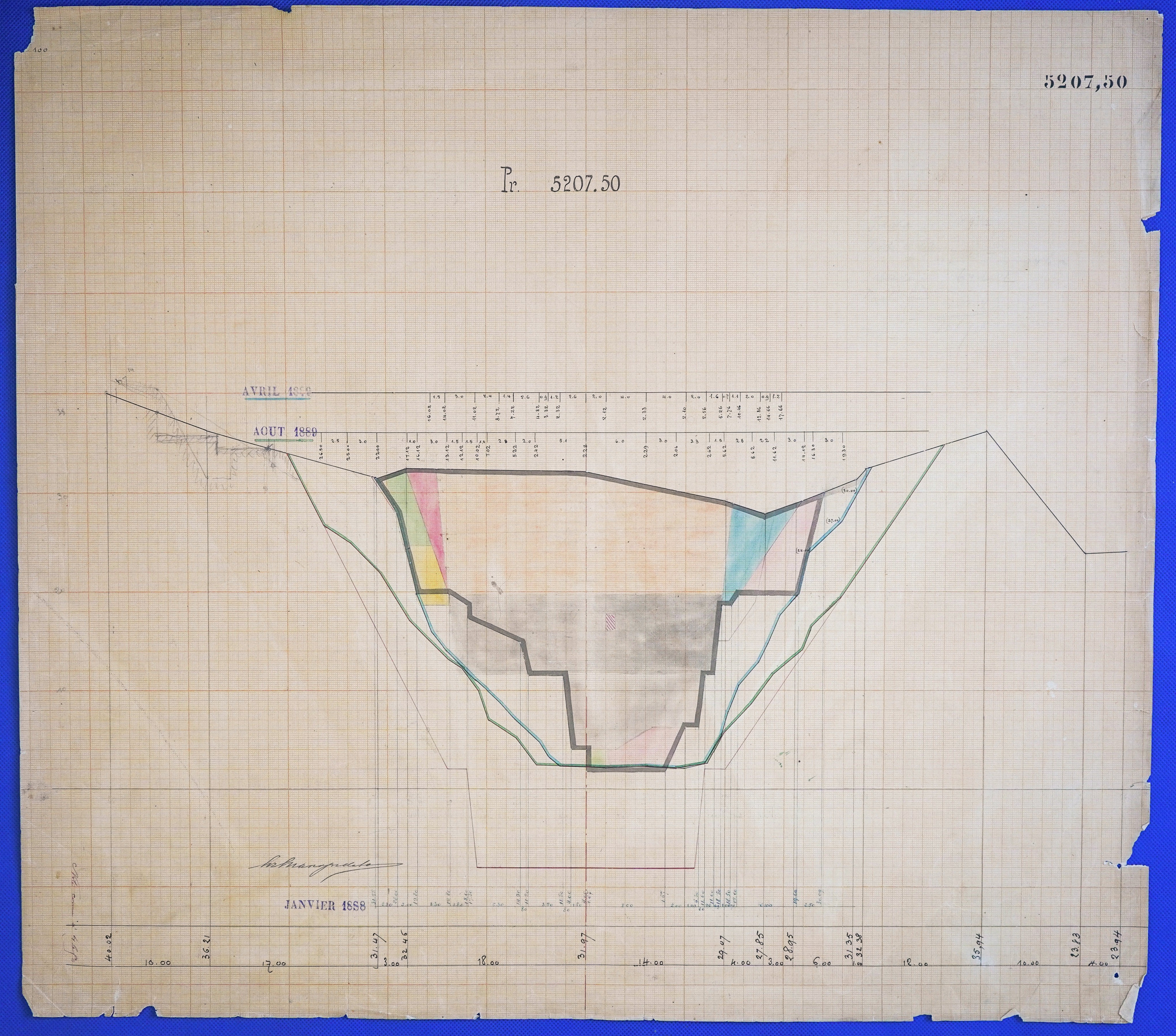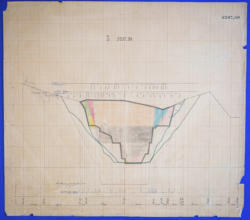 - Έγχρωμο σχέδιο προόδου εκσκαφικών εργασιών (μηκοτομή) χιλ. σημείου 5207,50 με μελάνι και έγχρωμο μολύβι σε χαρτί μιλιμετρέ.