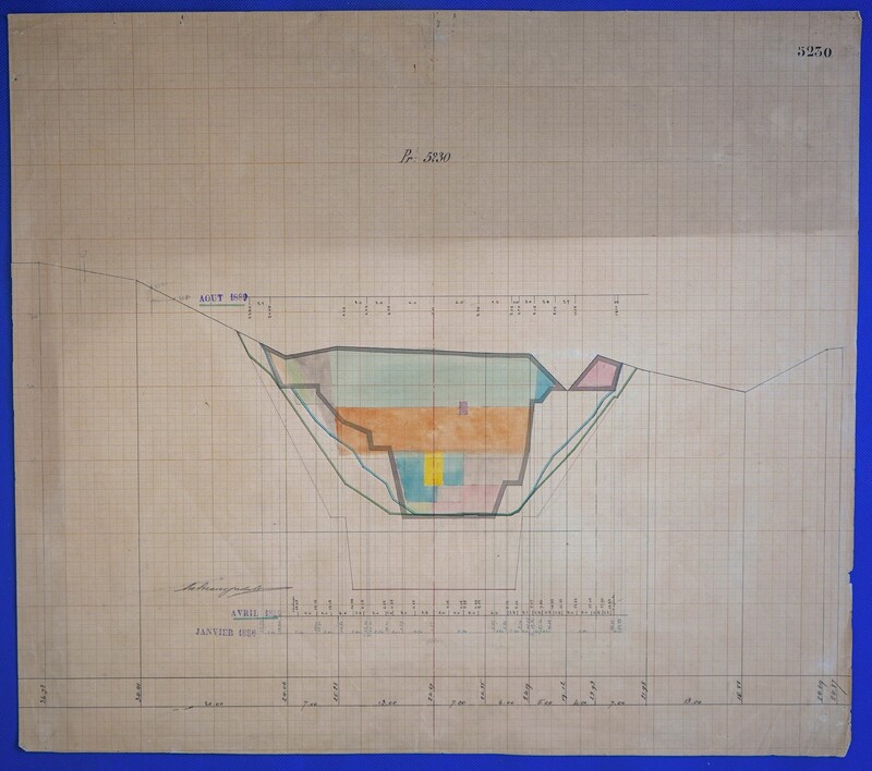 - Έγχρωμο σχέδιο προόδου εκσκαφικών εργασιών (μηκοτομή) χιλ. σημείου 5230 με μελάνι και έγχρωμο μολύβι σε χαρτί μιλιμετρέ.