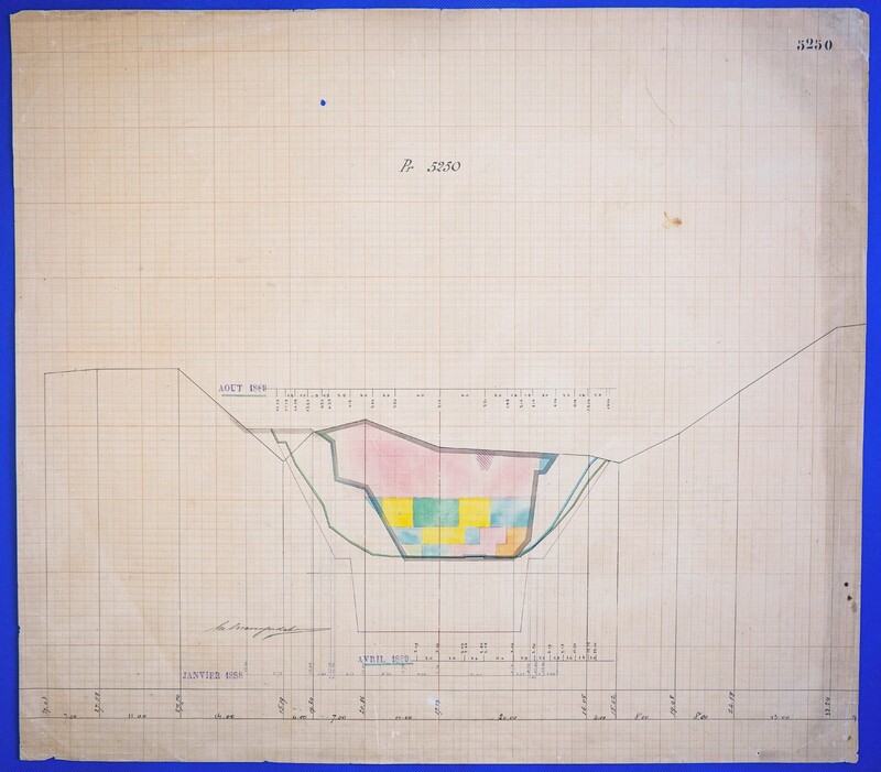 - Έγχρωμο σχέδιο προόδου εκσκαφικών εργασιών (μηκοτομή) χιλ. σημείου 5250 με μελάνι και έγχρωμο μολύβι σε χαρτί μιλιμετρέ.