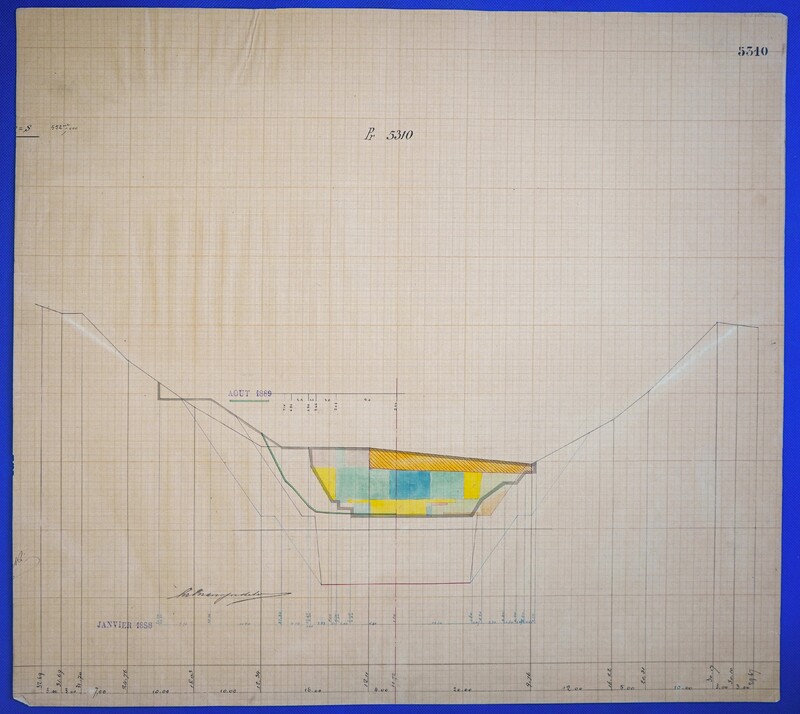 - Έγχρωμο σχέδιο προόδου εκσκαφικών εργασιών (μηκοτομή) χιλ. σημείου 5310 με μελάνι και έγχρωμο μολύβι σε χαρτί μιλιμετρέ.