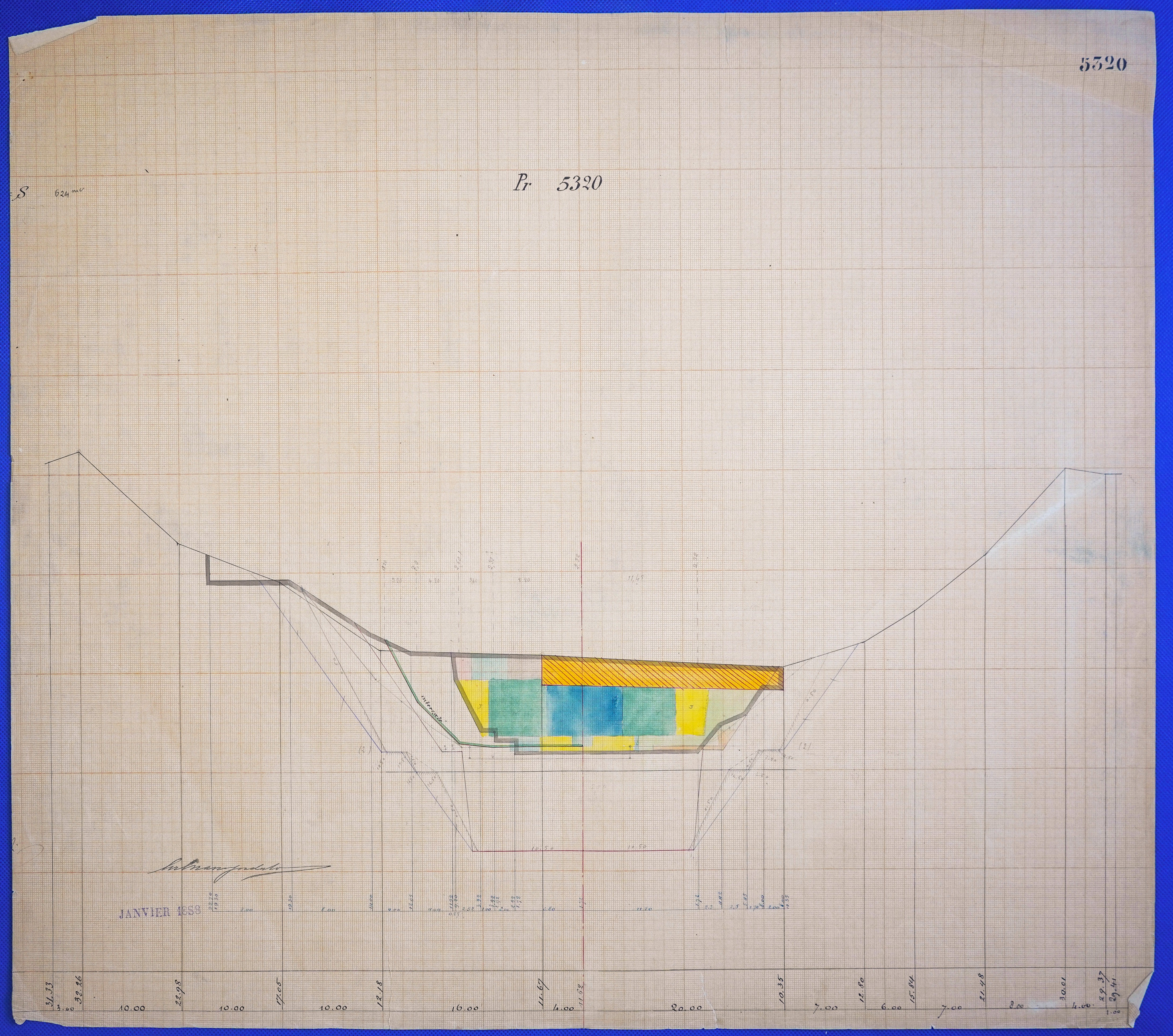 - Έγχρωμο σχέδιο προόδου εκσκαφικών εργασιών (μηκοτομή) χιλ. σημείου 5320 με μελάνι και έγχρωμο μολύβι σε χαρτί μιλιμετρέ.