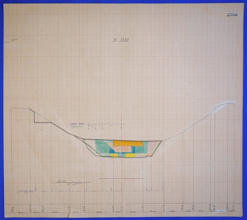 - Έγχρωμο σχέδιο προόδου εκσκαφικών εργασιών (μηκοτομή) χιλ. σημείου 5350 με μελάνι και έγχρωμο μολύβι σε χαρτί μιλιμετρέ.