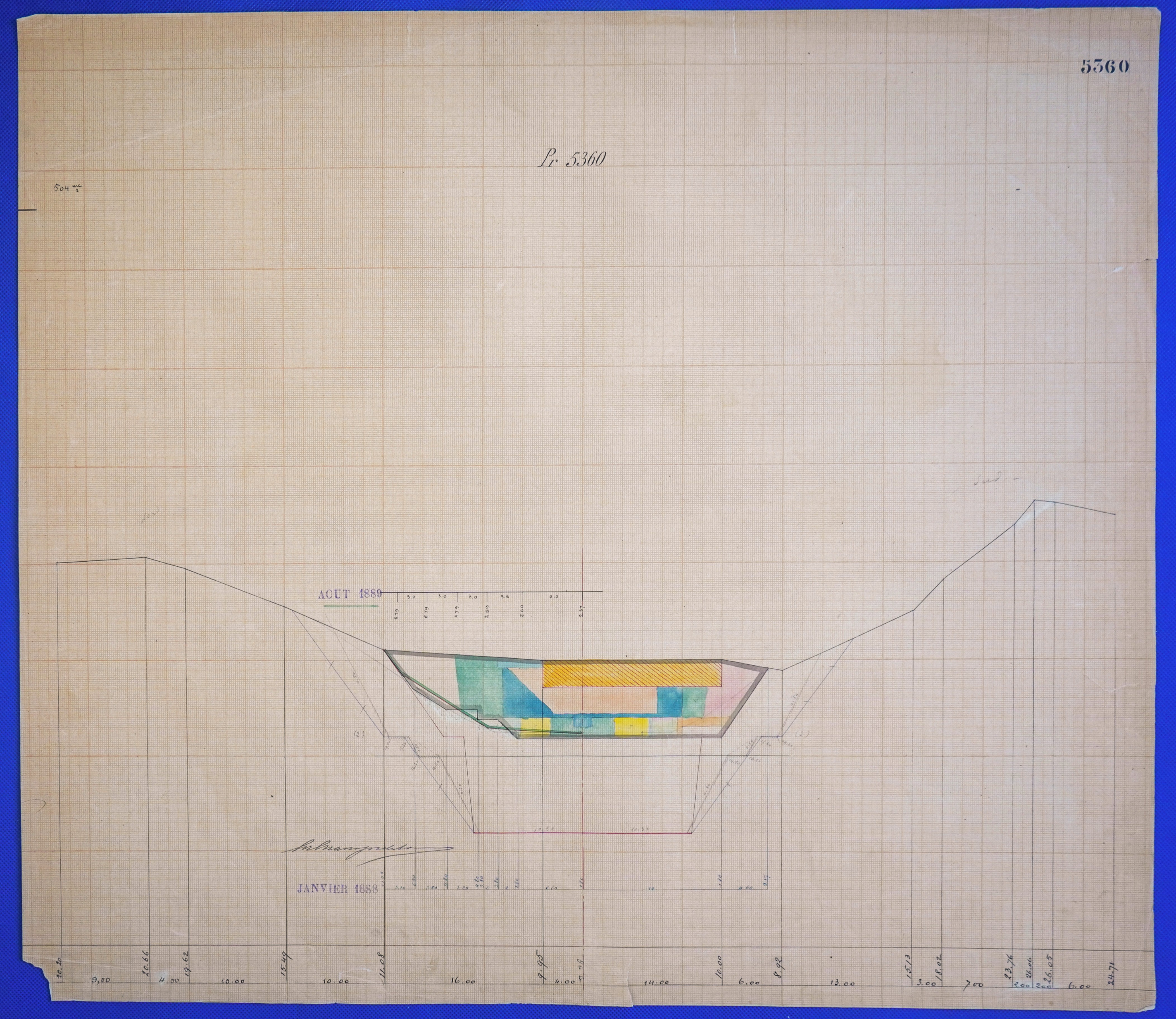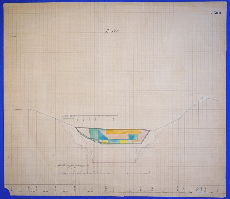 - Έγχρωμο σχέδιο προόδου εκσκαφικών εργασιών (μηκοτομή) χιλ. σημείου 5360 με μελάνι και έγχρωμο μολύβι σε χαρτί μιλιμετρέ.