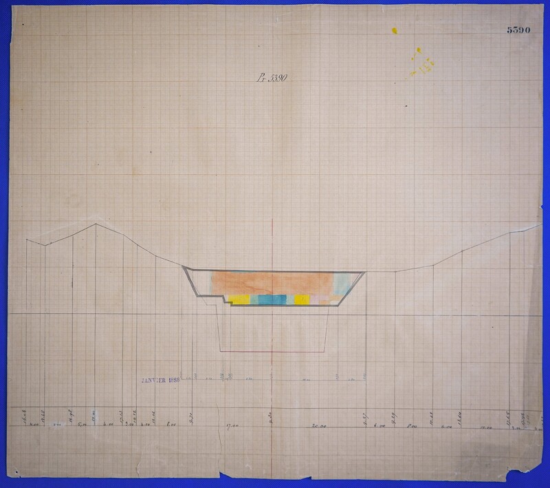 - Έγχρωμο σχέδιο προόδου εκσκαφικών εργασιών (μηκοτομή) χιλ. σημείου 5390 με μελάνι και έγχρωμο μολύβι σε χαρτί μιλιμετρέ.