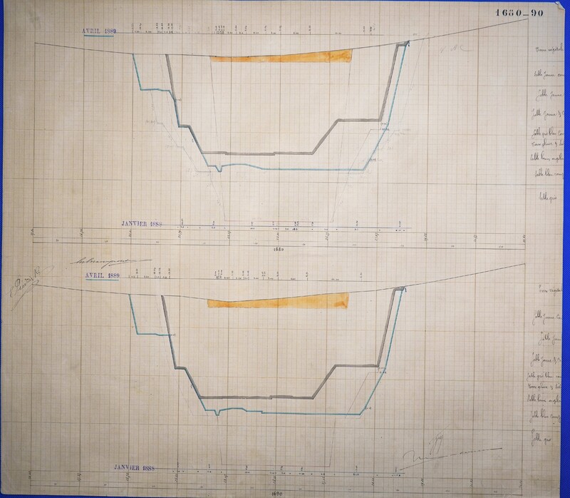 - Έγχρωμο σχέδιο προόδου εκσκαφικών εργασιών (μηκοτομή) χιλ. σημείου 1680-90 με μελάνι και έγχρωμο μολύβι σε χαρτί μιλιμετρέ.