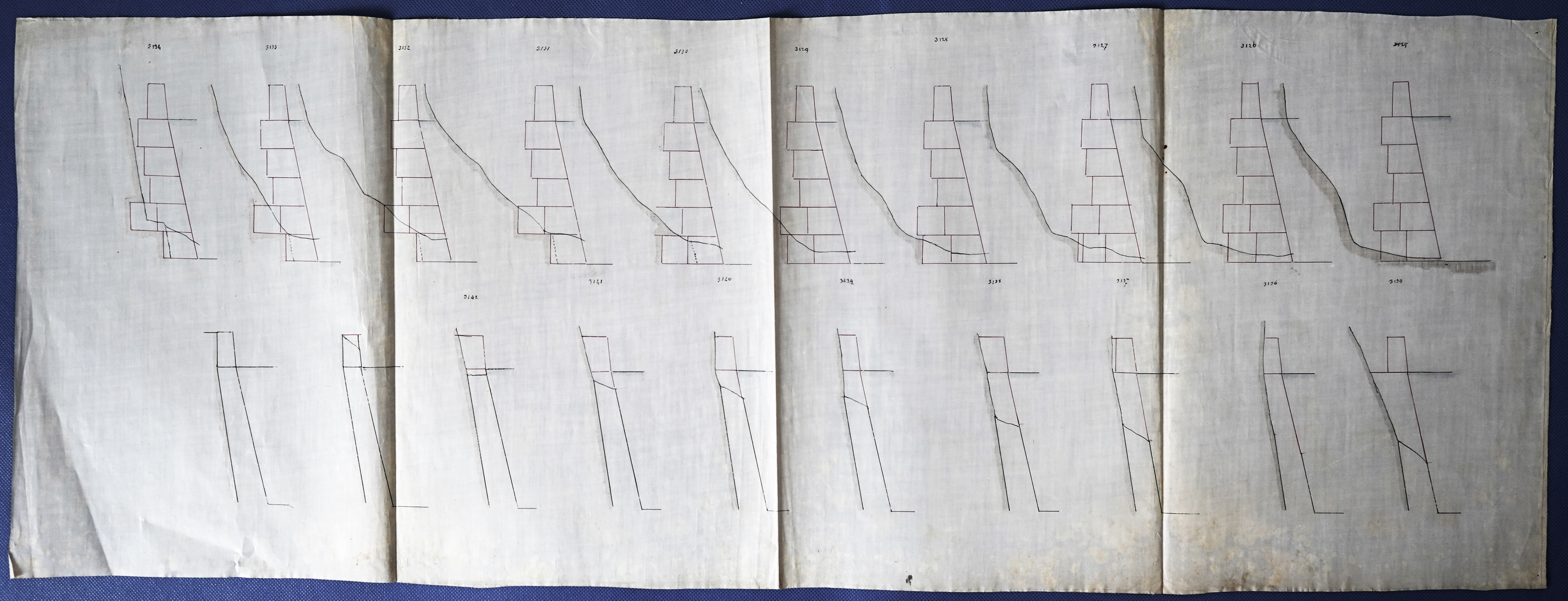 - Τομές πρανών της Διώρυγας ανά χιλιομετρικό σημείο με απεικόνιση των κτιστών κρηπιδωμάτων όπου υπάρχουν.