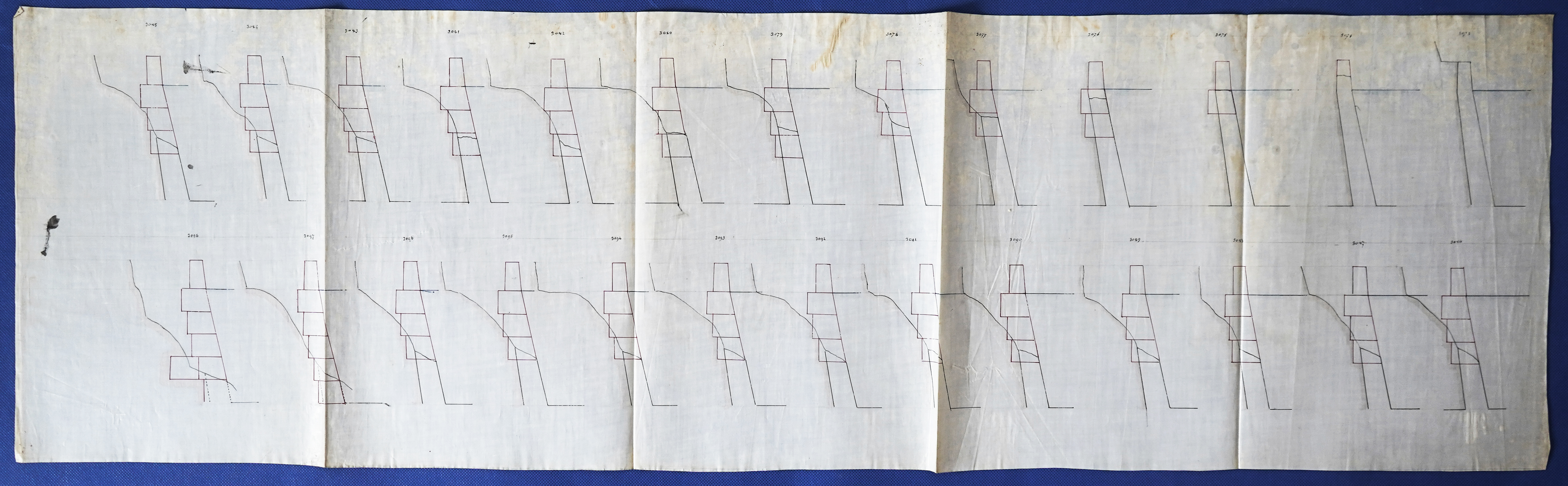 - Τομές πρανών της Διώρυγας ανά χιλιομετρικό σημείο με απεικόνιση των κτιστών κρηπιδωμάτων όπου υπάρχουν.