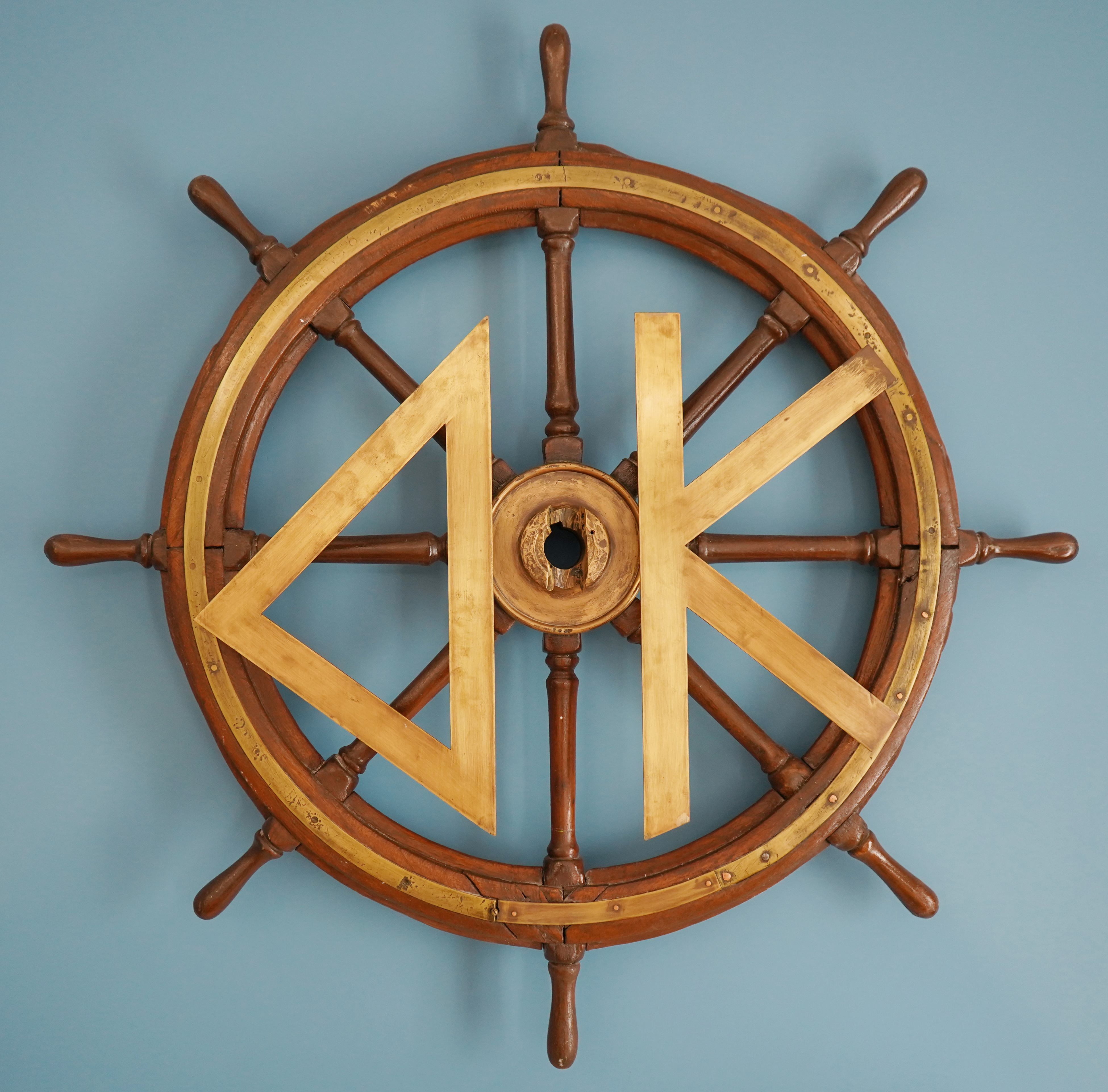 - Ξύλινο διακοσμητικό τιμόνι πλοίου με 8 ακτίνες με τα αρχικά ΔΚ (Διώρυγα Κορίνθου) από μέταλλο στην πρόσοψη.